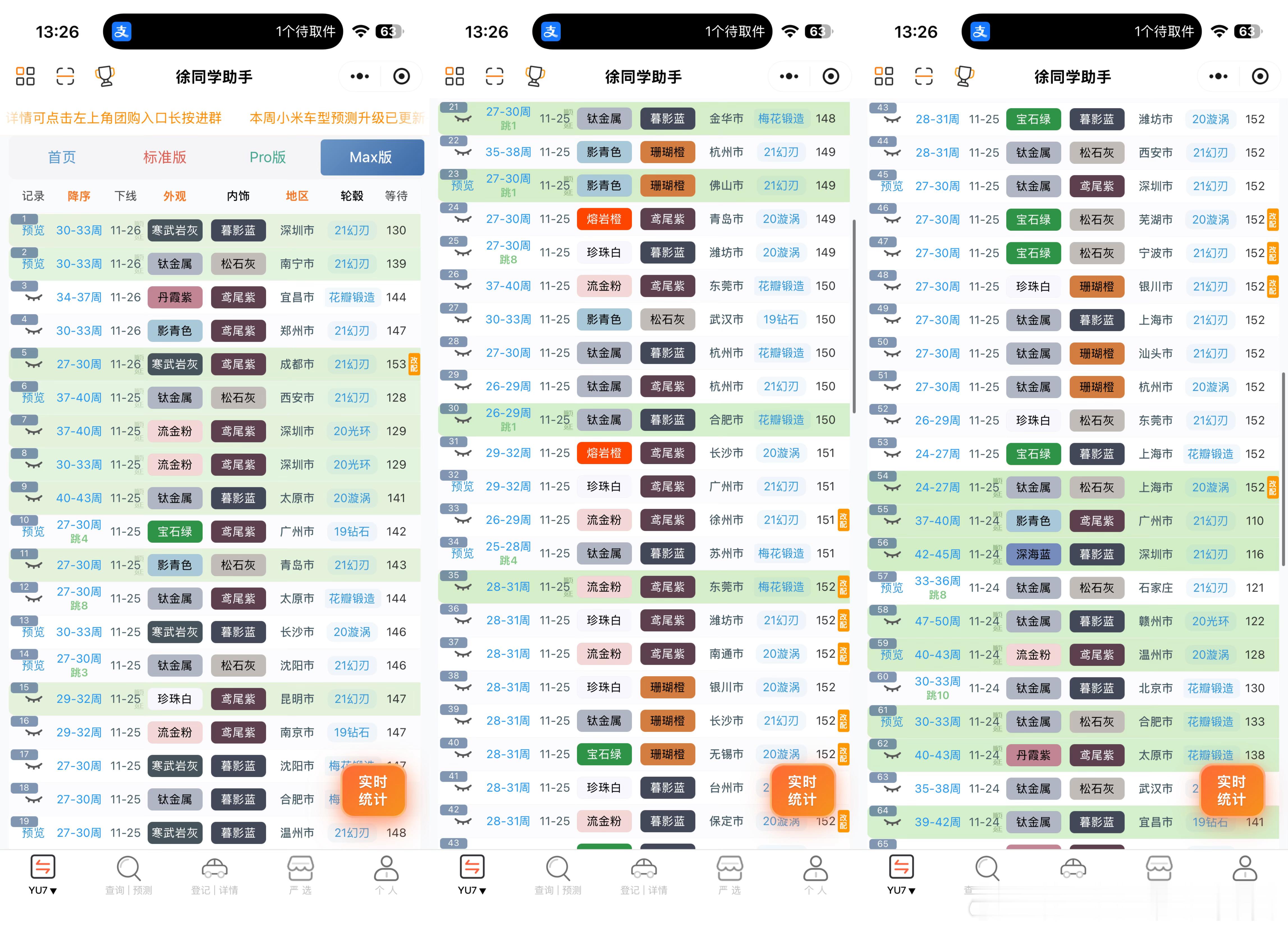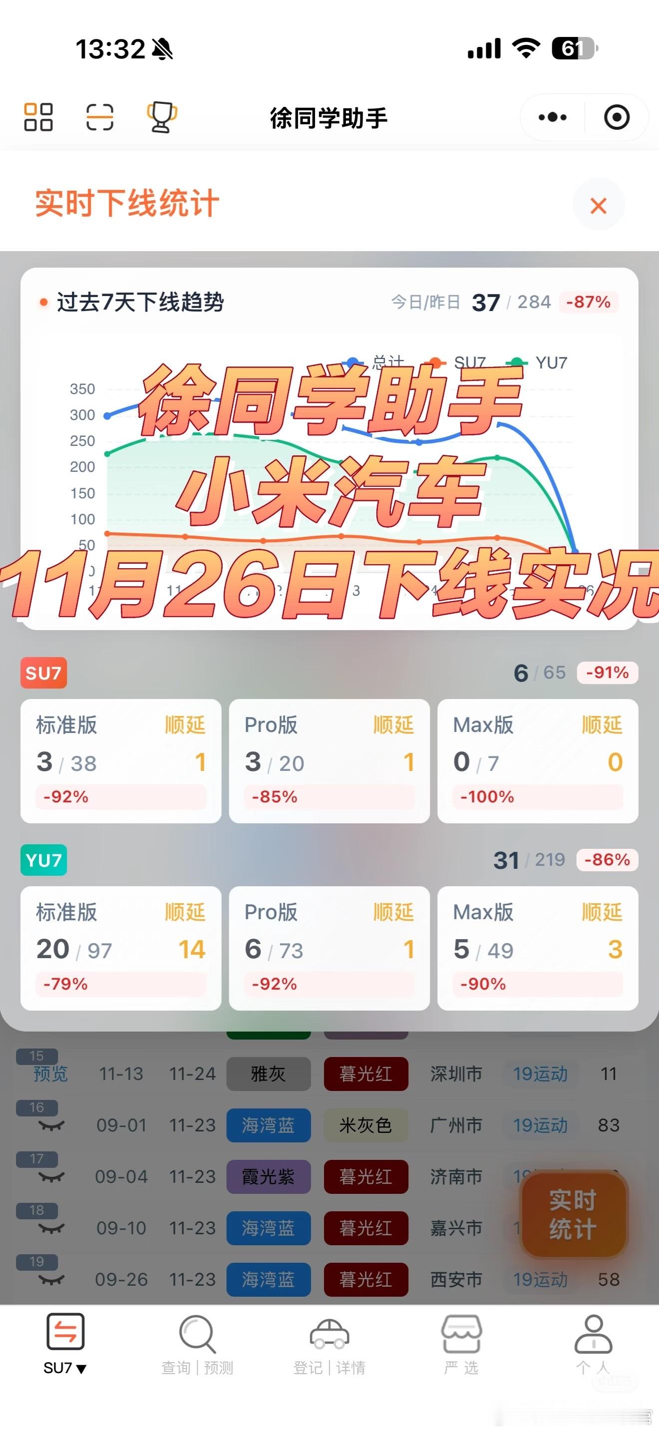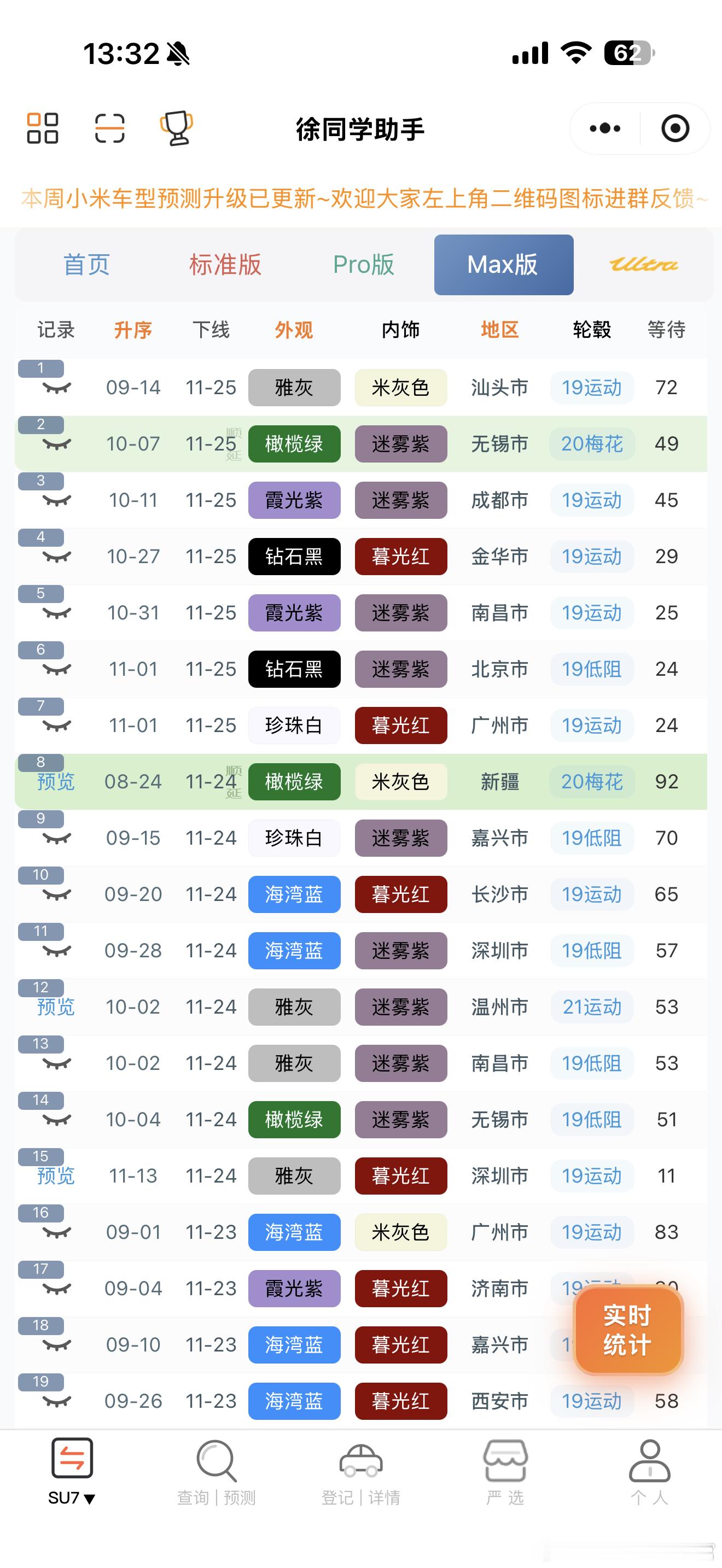 小米汽车(11月26日)下线实况小米交付权限好像升级了,刚有人给我看了下聊天记录,交付刚通知他的车进入前500台交付区间了,其他没交付的小伙伴也去群里问问呀看看是不是普遍都这样了,等你们好消息🌀YU7(据不完全统计)合计219台1️⃣标准:下线97台,大部队都是在顺延30周左右的了(初始周),北京该来一批了2️⃣Pro:下线73台,垫底的不少啊,24周的还在正常下线的,正常进度在26-27周3️⃣Max:下线49台,大部队27-30周左右的随时下线,月底30周交完是实现不了了🌀SU7(据不完全统计)合计65台1️⃣标准:下线38台,大部队6-7月,绿色来了一起2️⃣Pro:下线20台,订单不多了,一个月都能交付完3️⃣Max:下线7台,没啥车了4️⃣ultra:无更多关于小米汽车的最新资讯和深度解析,请参考【米车派】~徐同学助手汽场全开