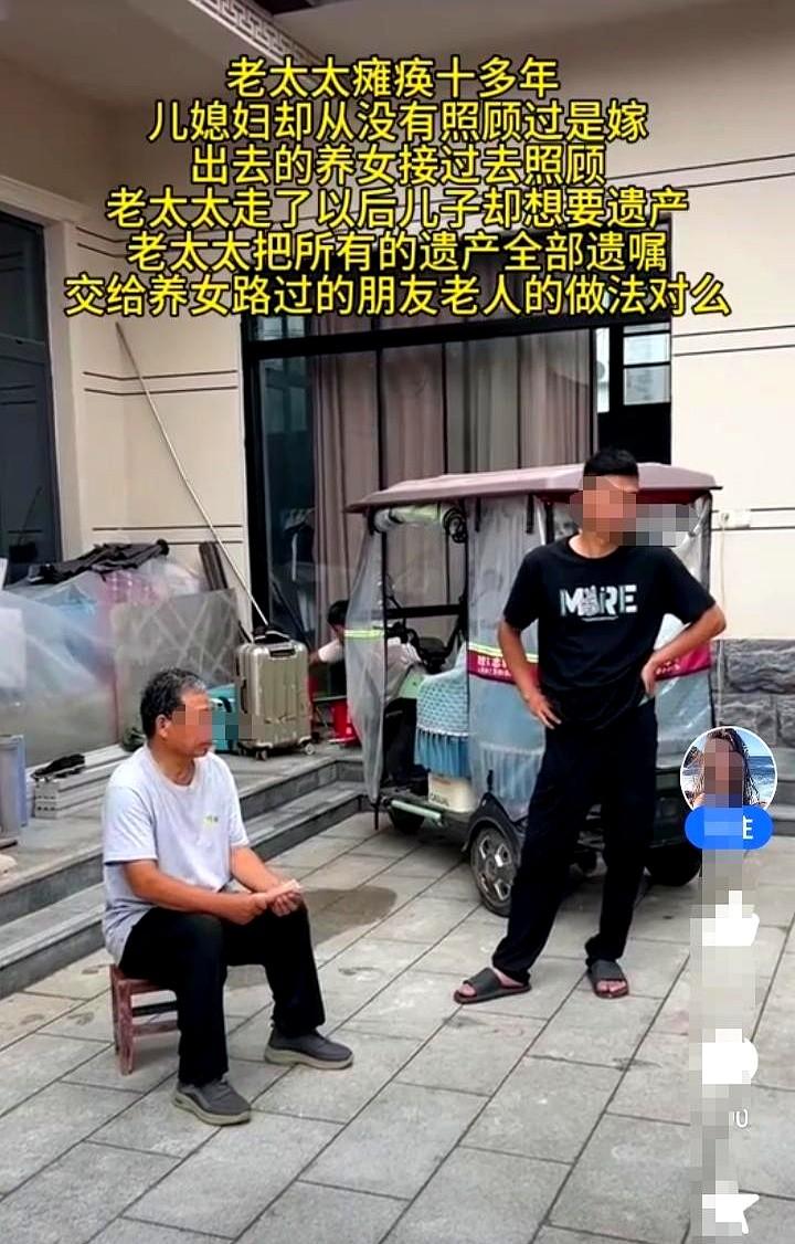 老人瘫痪十几年,儿子儿媳妇因为受不了老人身上的异味分家出去住! 养女看不下去就把老人接回家里照顾,这一照顾就是十年。 老人去世后把遗产全留给了养女,亲生儿子儿媳马上跑回来,闹着说他们才是继承人,要拿走所有财产。 他们在母亲最需要照顾的时候躲开了,现在母亲不在了,他们反倒为了钱回来宣示自己的权利。