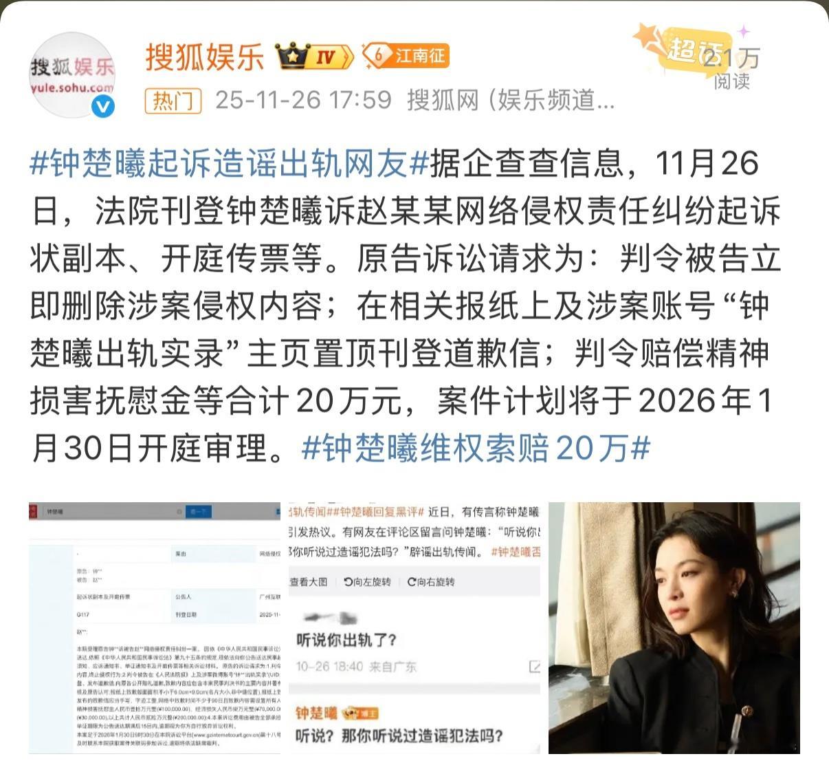 钟楚曦起诉造谣出轨网友 长期造 谣 辱 骂,言辞恶 劣,换谁谁都要告。支持钟楚曦维权,互联网不是法 外之地👊🏻
