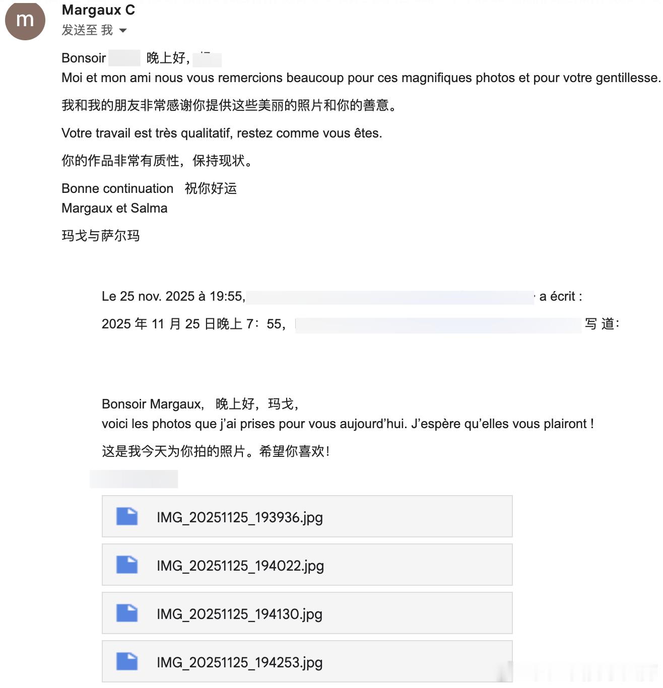 昨天在溜大街的时候,两个法国妹子看我在那拍照,就问能不能帮她们也拍几张。拍完后她们非常惊讶于中国品牌手机的人像效果,还问我法国能不能买得到。后面我让她们给我留了个邮箱,到时发给她们。晚上发过去没多久,就收到了妹子回复的“表扬信” 法国·塞纳河