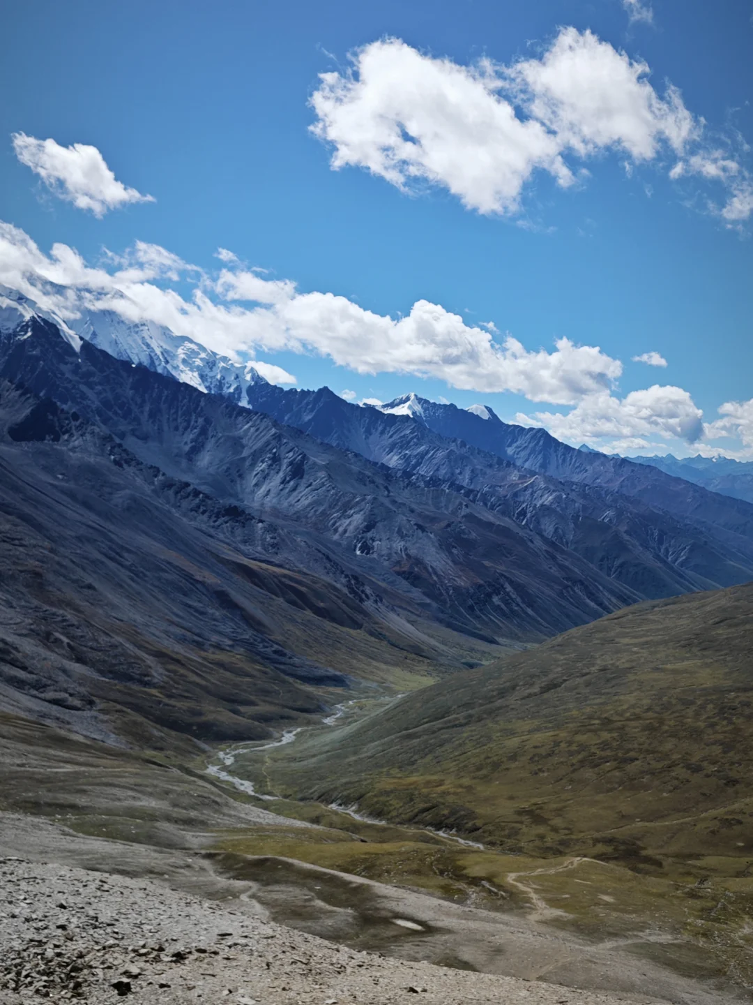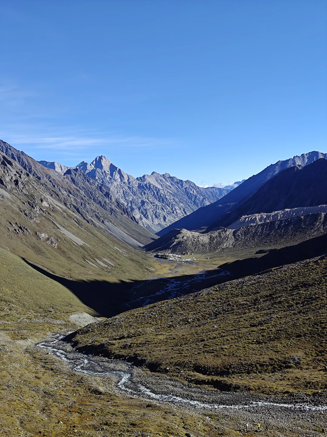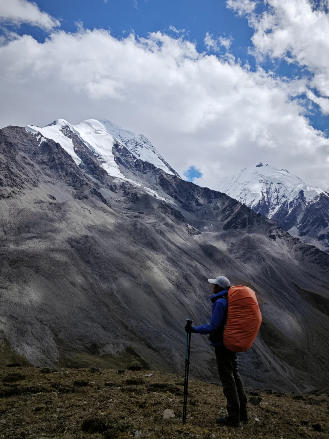 10月11日,贡嘎大环线之西一山脊线徒步的第三天。今天的行程是从勒多曼因冰湖出发,爬升翻越日乌且垭口,下到山脊线与山谷线岔路口后走山脊线,途经科西德,最终在备用营地扎营。全程约10公里,爬升约540米,下降约610米,耗时7小时。