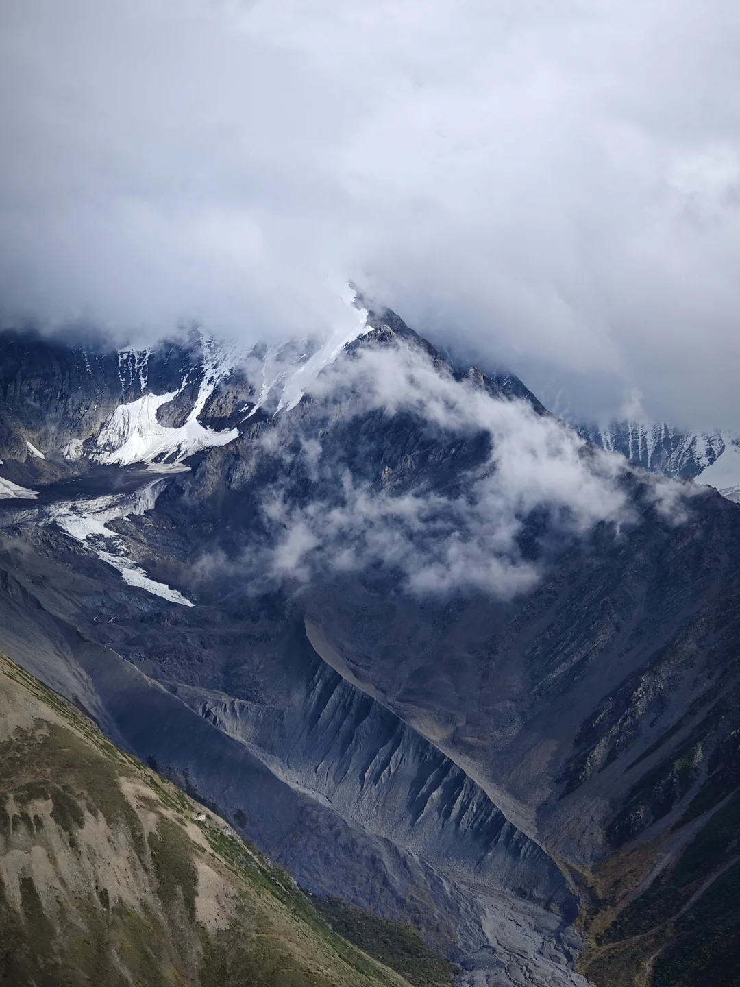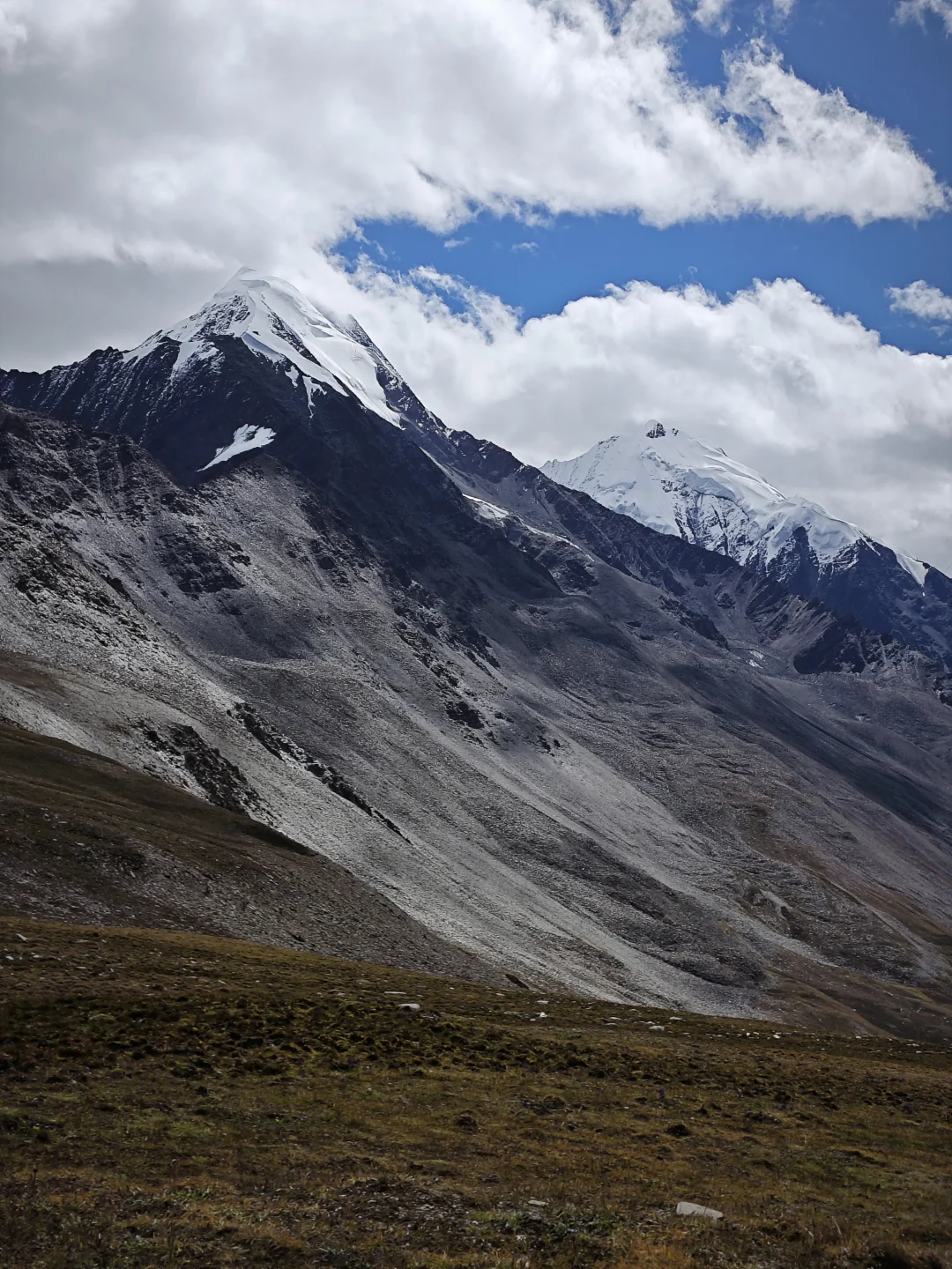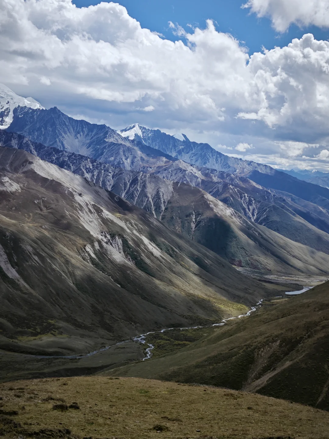 从勒多曼因冰湖切上日乌且哑口是一段持续爬坡路段,因海拔高、空气稀薄,坡度又陡,走的比较累,也因海拔高、植被稀疏,路况还算良好,视野很开阔。