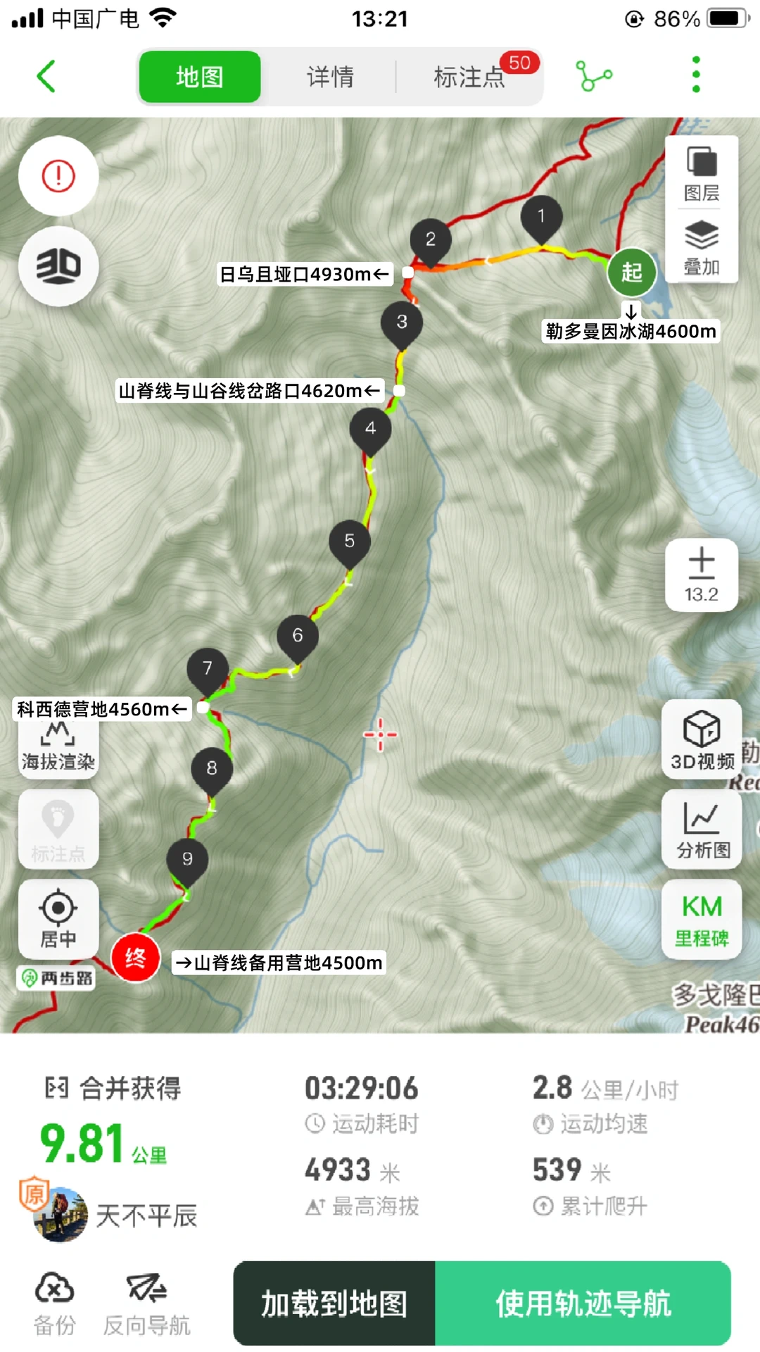 ❷行程:勒多曼因冰湖4600m→日乌且垭口4930m→山脊线与山谷线岔路口4620m→科西德营地4560m→山脊线备用营地4500m