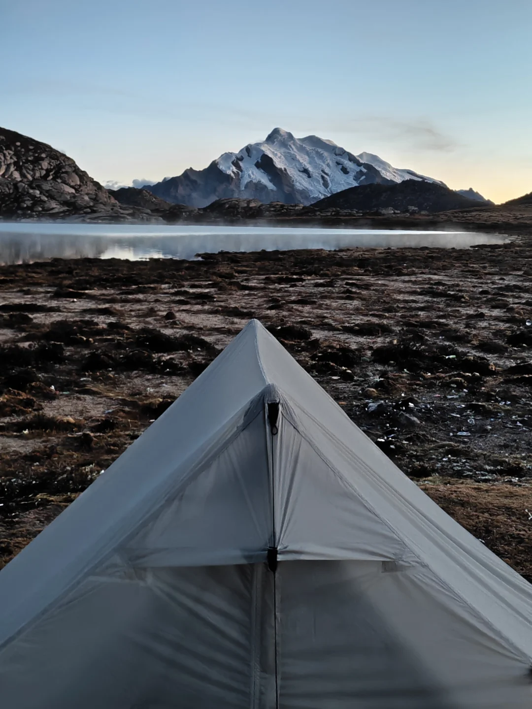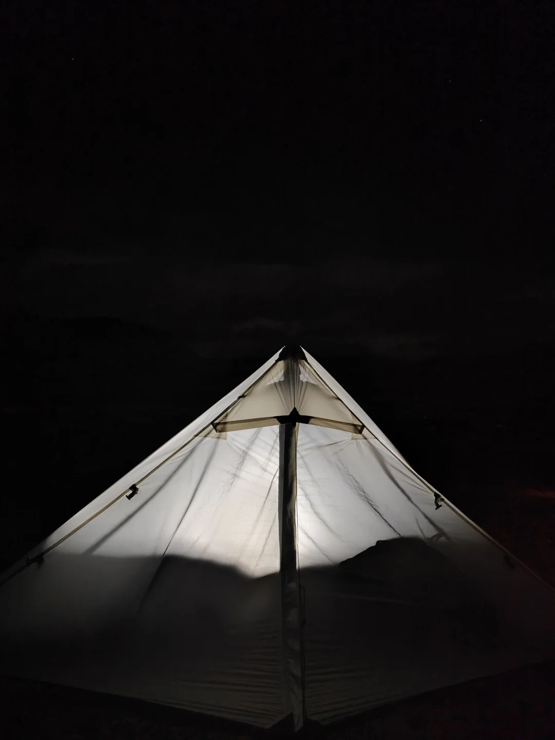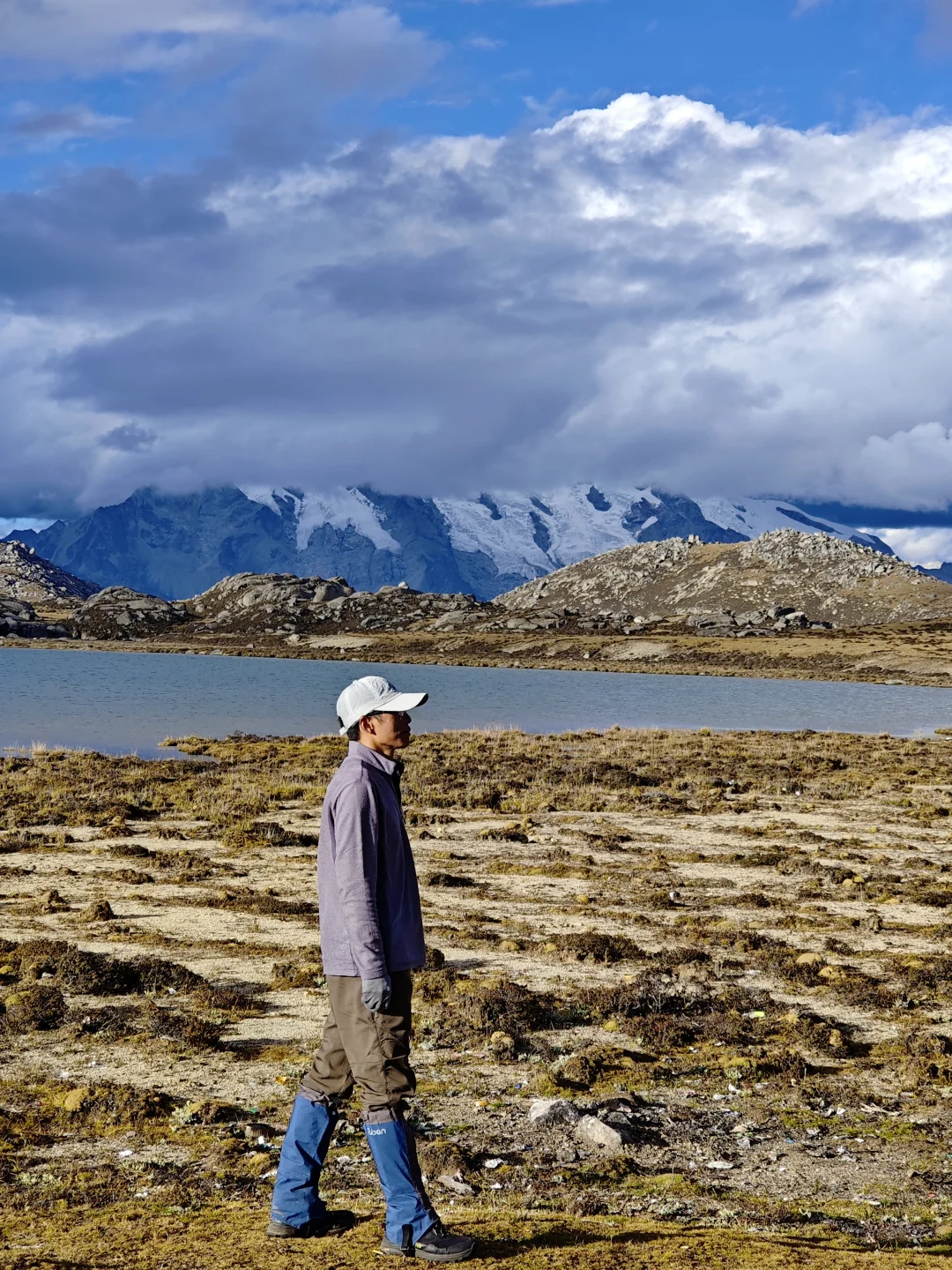 15:49我们登上路线最高点——海拔4870米垭口,因垭口景色一般且风大,我们未多作停留,短暂休息继续赶路。接下来的路段相对平缓,多为缓坡下降,伴随缓坡爬升,但海拔均在4700米以上,走起来也不轻松。17:25到达途中的大石头,到这里意味着措娘卡湖也不远了,17:53到达措娘卡湖边,我们选了一个正对格聂雪山的营地,然后扎好帐篷打好水,我又折返去寻掉队的队友,所幸他掉队不远,赶在天黑前到达营地。