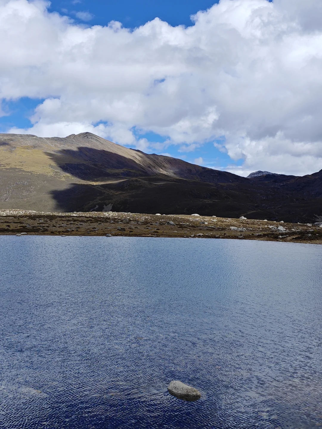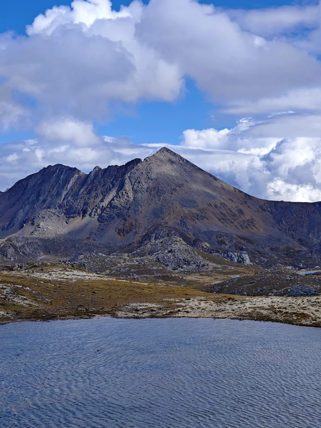 我早上8:56从夯达营地出发,约9:30追上队友,这段路上遇到了不少到牧屋营地(河谷营地/虫草营地)的驴友,也遇到三位同样到措娘卡的朋友,于是我们6人同行;中午12:00整我率先到达Z字坡下并在这里吃路餐,12:39开始爬Z字坡,13:30到达牧屋营地(河谷营地/虫草营地),14:10翻上小垭口看见第一个海子,之后进入高低起伏路段,此路段最少有10个高山湖泊,也因地势高低起伏,海拔高,爬升大,也是比较累的路段。在此路段有一位队友掉队。