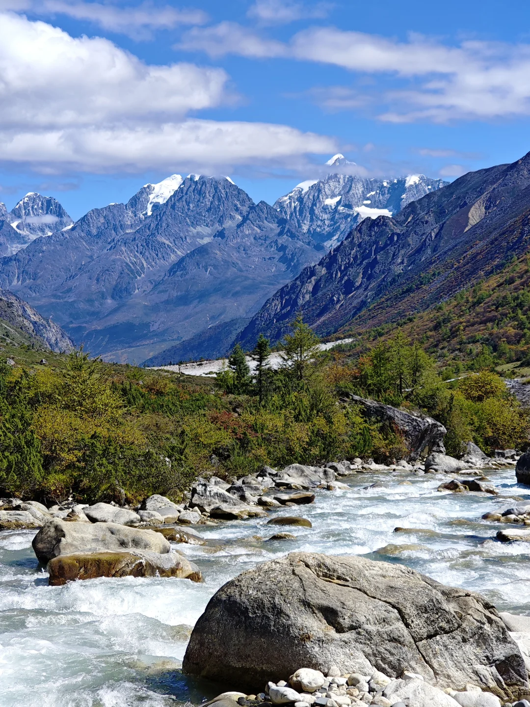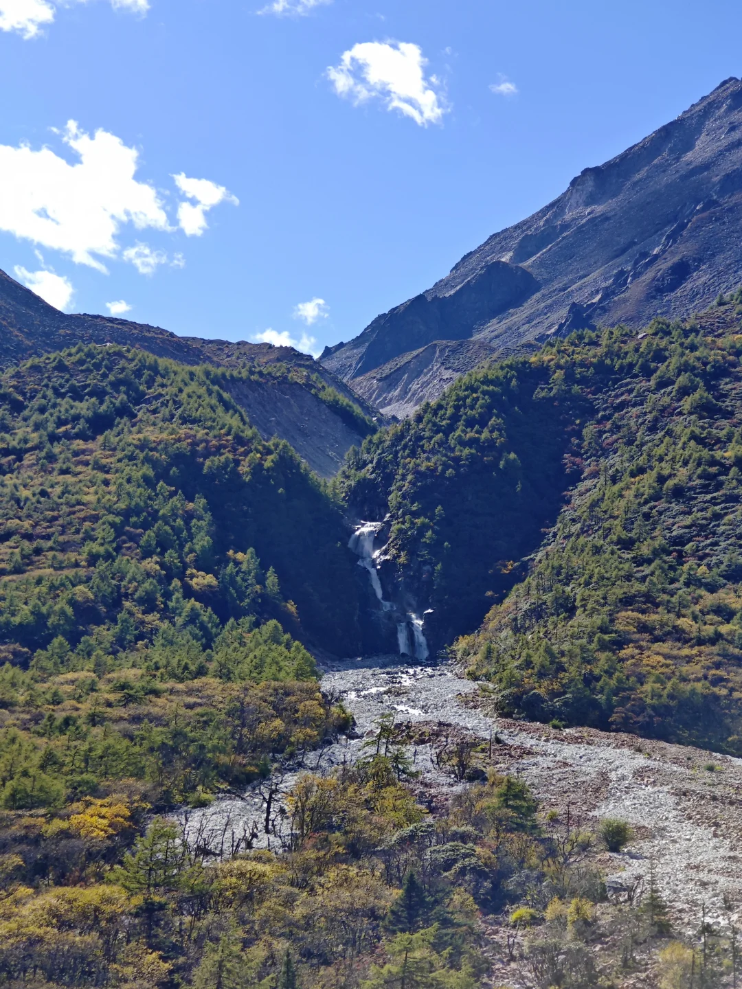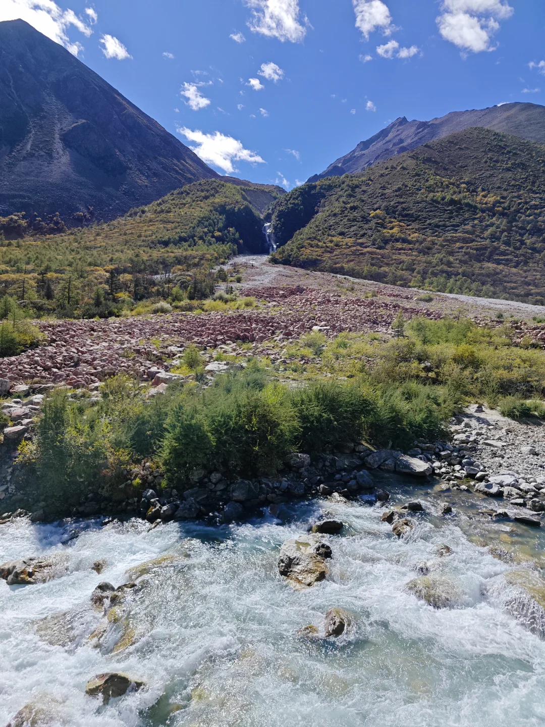 今日行程均在日乌且沟里行走,两侧高山耸立,中间榆林河溪水潺潺。从老榆林一路走来可回望远眺康定白海子山、蛇海子山等;红石滩有高山瀑布;两岔河营地仰望山沟两侧高耸的隐海子山、独海子山、加折拉山,过了两岔河营地可以小贡嘎山、鹊巴峰等雪山。