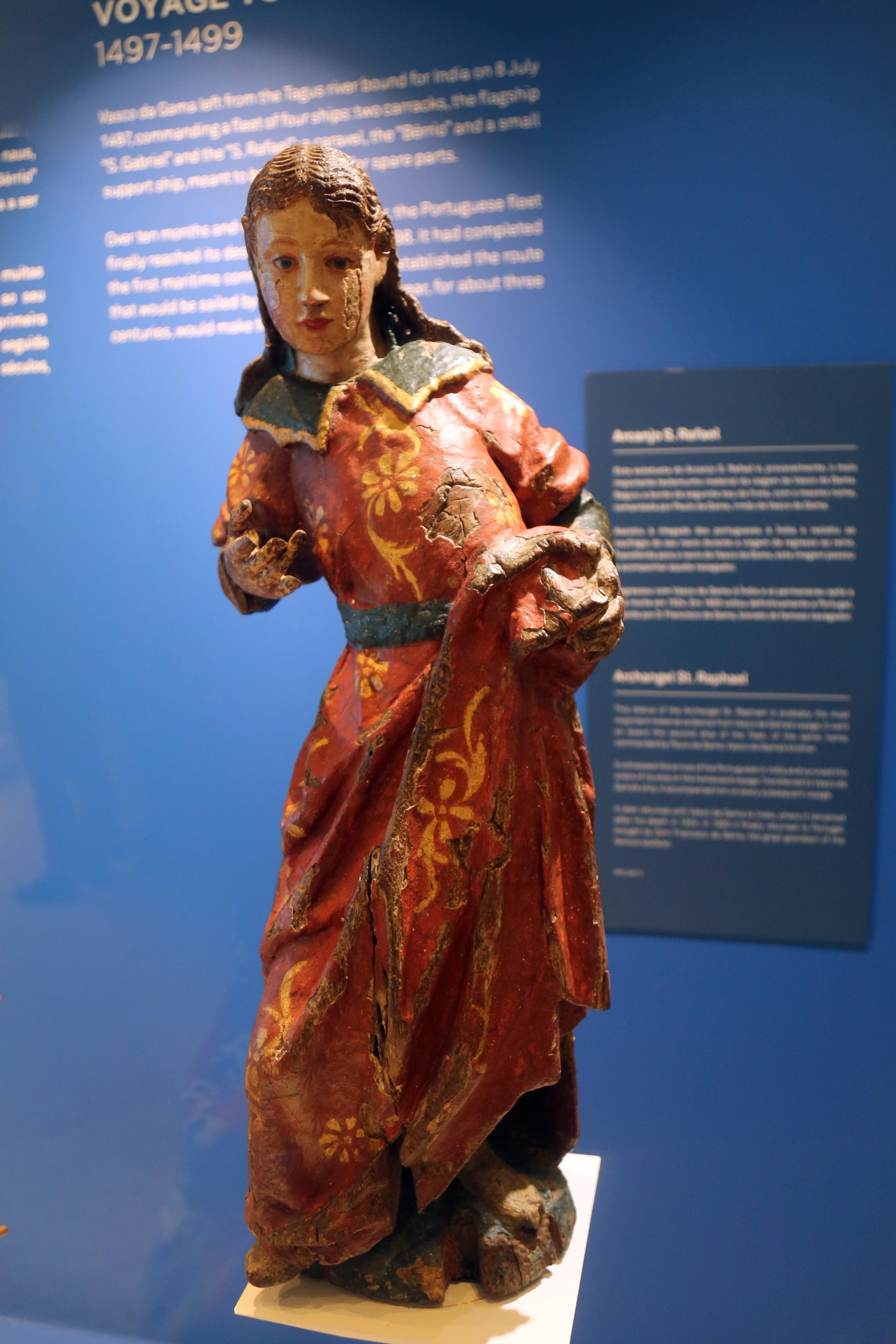 里斯本航海博物馆藏达伽马船队的船模型和当时舰队第二条船上的大天使圣拉斐尔彩绘木雕。这件木雕见证了达伽马船队绕过好望角到达印度,在达伽马1524年去世后就一直放在印度,直到1600年达伽马的重孙才将其带回葡萄牙