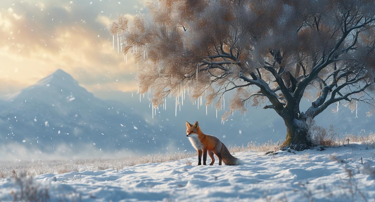 一张图证明冬天来了在一片白雪皑皑的广阔原野上,天空中飘落着轻盈的雪花,空气中弥漫着清新寒冷的气息。一棵孤独的树枝繁叶茂,树上悬挂着晶莹剔透的冰凌,像是自然的艺术品。树的旁边,一只毛茸茸的狐狸静静地站立,身上覆盖着一层薄薄的雪,眼神中透露出迎接冬天的喜悦。远处的山峦被白雪覆盖,云雾缭绕,营造出神秘而宁静的氛围。一只羽毛飘落在雪地上,象征着冬天的到来。