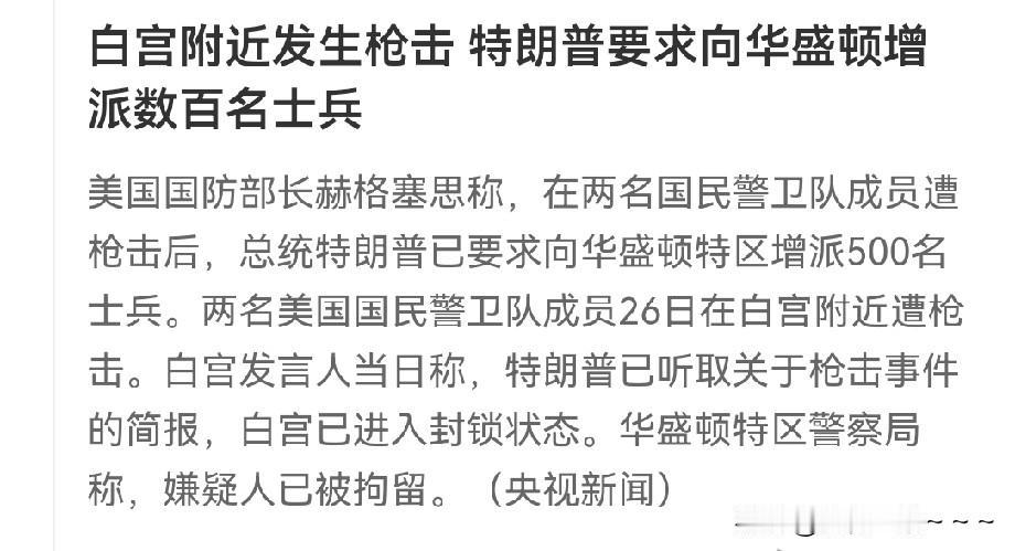 突发! 一大早,美国🇺🇸天塌了? 白宫附近发生了枪击事件,2名国民警卫队成员被枪杀! 这大白天在白宫附近暗杀国民警卫队,可以看出枪手虽然已经被捕,但是,来者不善,估计是早有预谋。难道是对国民警卫队最近在华盛顿上街抓人、赶人走不满吗? 为此,特朗普紧急命令,部署500名士兵,严阵以待,防止此类事情再次发生,要知道,现在美国人人有枪,特朗普政府驱赶非法移民给哪批人带来了很大的不满,当然会担心事态扩大引发暴乱。