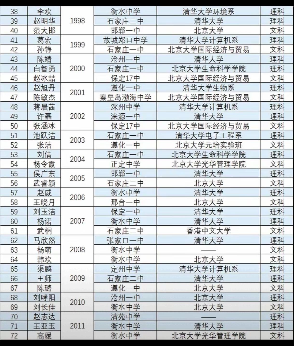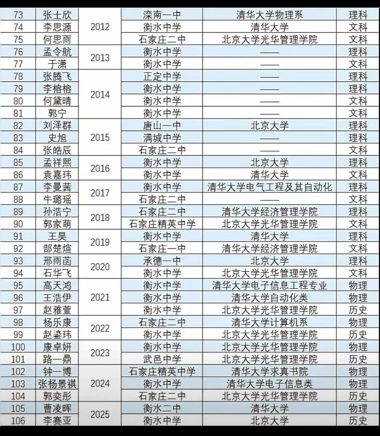 河北省历年高考状元,这应该是最全的了,涵盖了从1977年到2025年的状元、所在高中、录取大学和选科(或文理分科)情况(来自网络,可能不完全保真)。 不难看出,学校分布相当具有年代感。早期(2000年前),石家庄一中、石家庄二中、张家口一中等多地高中都有状元产出,分布相对分散。后期呢(尤其是2000年后),衡水中学成为状元“大户”,多次包揽文理状元;石家庄二中、石家庄一中也持续有状元诞生,呈现出优质高中的集中化趋势。 状元们主要被清华大学、北京大学录取,部分进入中国科学技术大学、中国人民大学、香港中文大学等顶尖高校,且多选择计算机、电子工程、经济管理等热门或优势专业。 选科(文理)变化也很有意思,早期明确区分理科和文科;新高考改革后(如2021年及以后),选科变为物理、历史等类别,体现了高考制度从文理分科到“3+1+2”选科模式的改革进程。 河北很多地方都出过状元,省内多个城市的高中如石家庄、衡水、沧州、邯郸、保定、秦皇岛、承德等都有过状元,曾经也百花齐放,只不过有一段时间是衡水出尽风头。 衡水中学近几年清北录取人数减少了不少,主要还是政策限制也就是掐尖招生通道被彻底切断,不让全省跨市掐尖了。2021年起,河北省实施严格的属地招生政策,公办高中不得跨市招生,且需将80%以上名额分配给本地初中。这直接导致衡水中学从“全省掐尖”变为“仅限衡水本地招生”,优质生源基数大幅缩减。巅峰时期,衡中外市生源占比超60%,而2025年外市生源占比不足10%。 这一政策利好石家庄,邯郸,唐山等地,衡水一家独大要改变了。