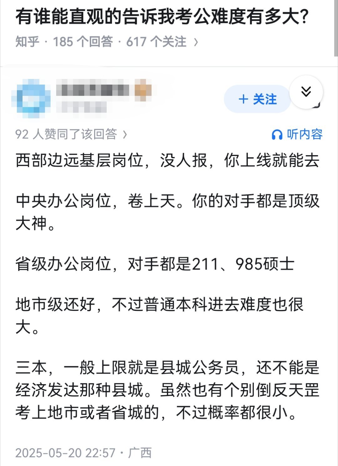 考公?那有个毛难度,跟学历关系不大,是个本科都能考进国务院,你说晋升那倒是卷得很。