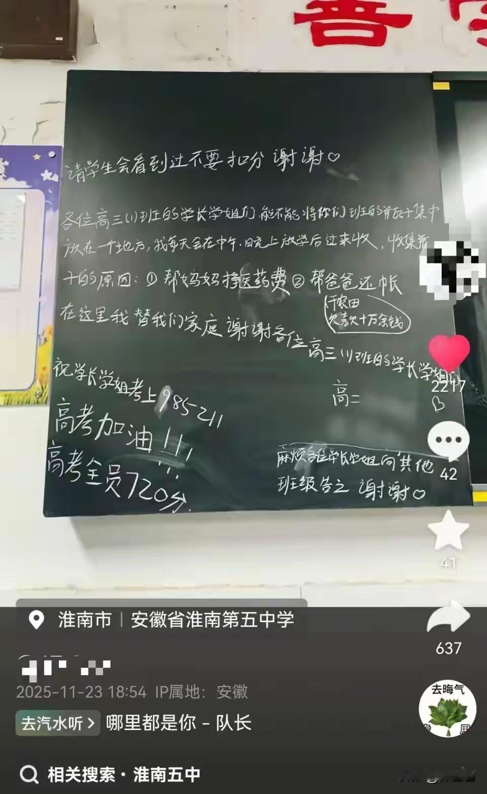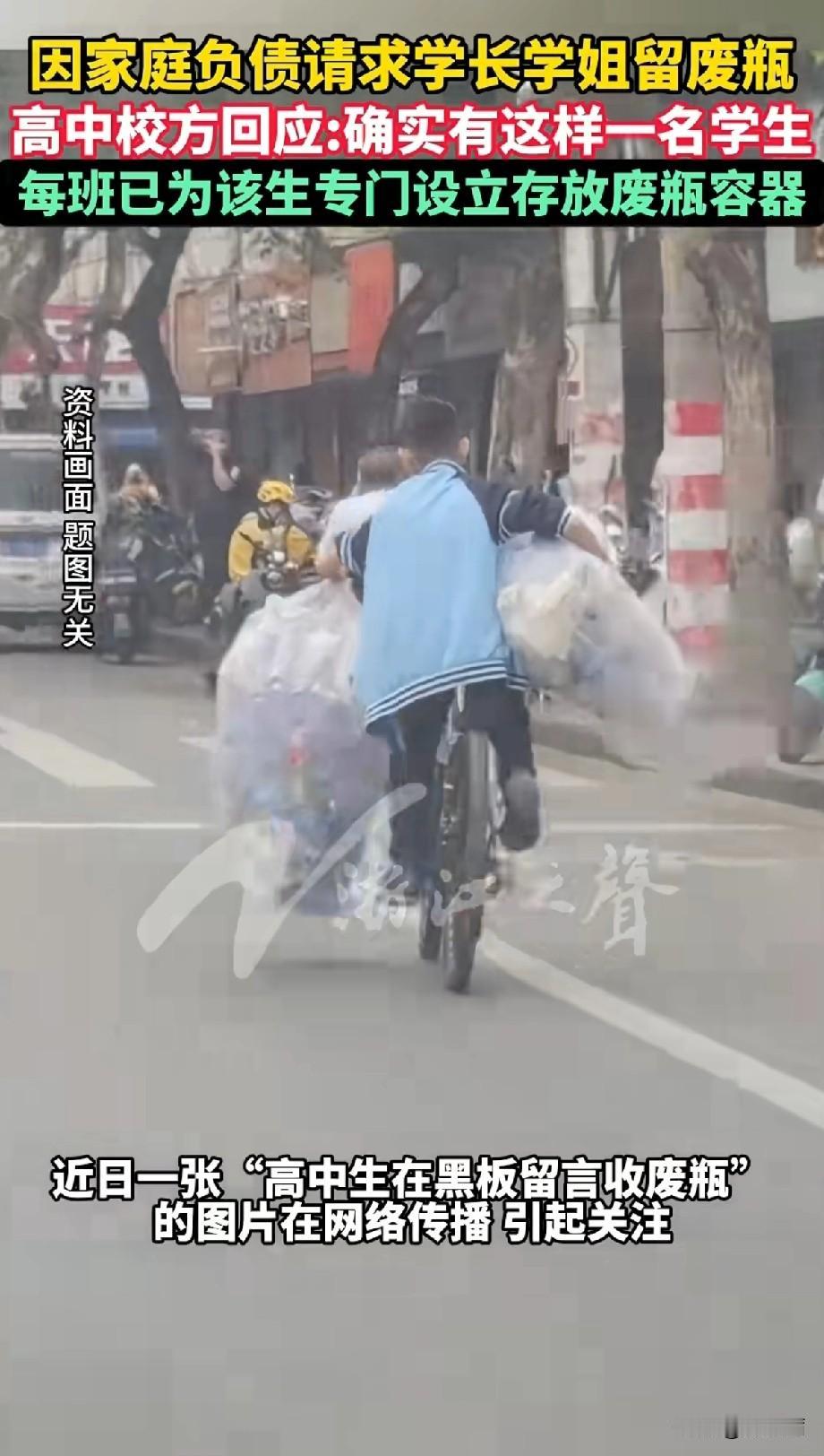 近日安徽淮南五中的校园里,高二学生小超(化名)的一则留言刷爆网络。 他在高三学长学姐的教室黑板上写道,希望大家把空瓶子集中存放,自己会放学后过来收,只为帮患类风湿病的妈妈挣医药费,替务农欠了十万余元的爸爸还债,末尾还不忘祝福学长学姐高考顺利,特意叮嘱学生会检查时不要扣分。 这段朴实又懂事的留言被同学发到网上后,很快收获满屏点赞。 大家纷纷为少年的担当点赞,有人说“这才是最帅的模样”,还有人愿意特意攒瓶子送去。 如今学校里每个班级都专门放了纸箱或水桶,方便小超集中收集,他每天中午和放学后都会背着编织袋去各教室收瓶,一天能挣20到40元。 更让人感动的是,面对众多想要捐款的好心人,小超明确表示不接受任何形式的捐款,只愿靠自己的劳动赚钱,还提醒大家别上当受骗。 他收瓶子时总会顺手帮班级关灯、清扫垃圾,用行动回报善意。 目前学校早已为他办理了国家助学金,还安排了图书馆勤工助学岗,后续计划再增加岗位,免费提供三餐并免去住宿费。 这个阳光开朗的少年,心里藏着考师范回母校当老师的梦想。 一瓶瓶不起眼的空塑料瓶,装着他对家人的爱与责任,也盛满了校园和社会的温暖,这样的双向奔赴,让这个冬天格外暖。淮南第五中学