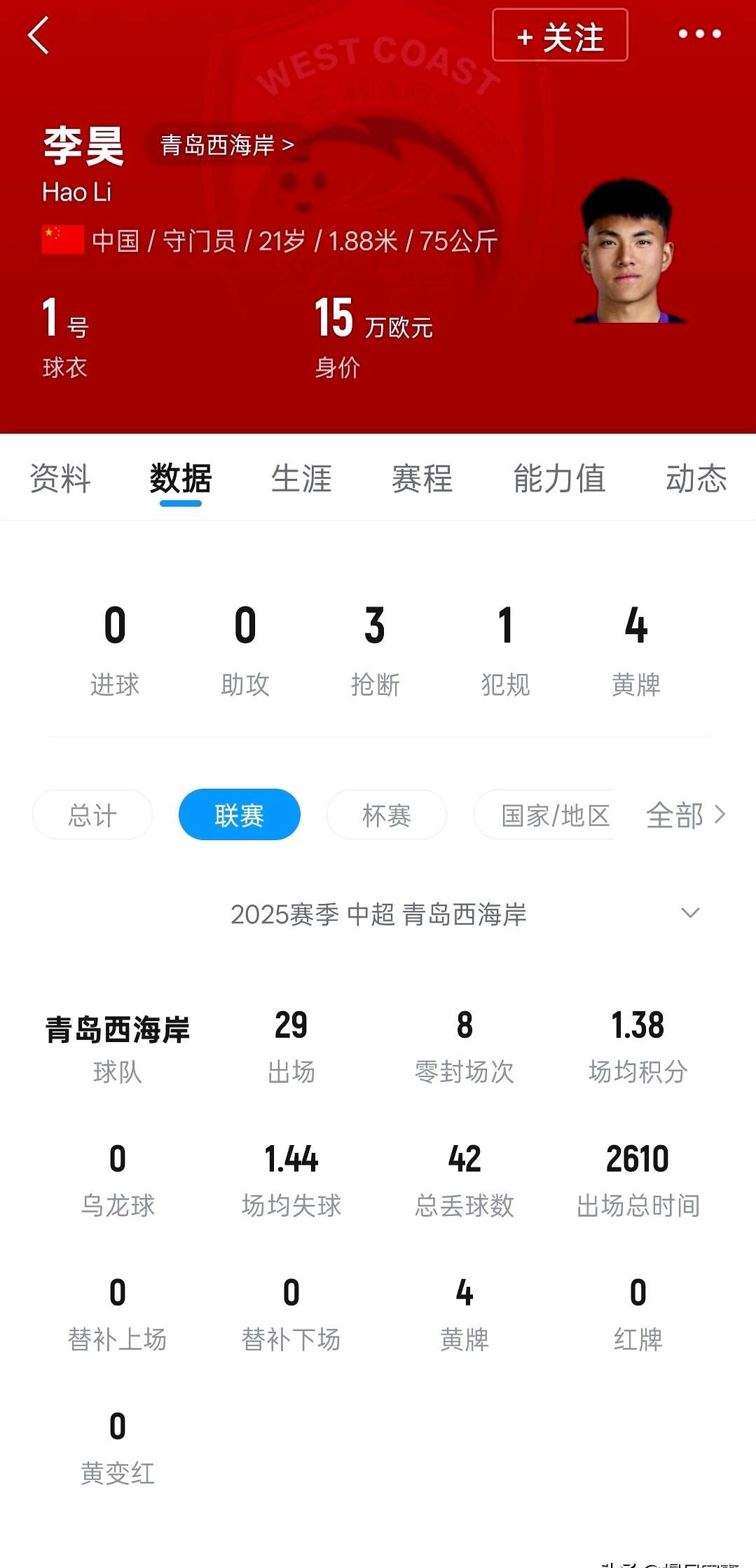 申花门将位置,这次真要换个活法了。 盯上了青岛西海岸的门将李昊,一个才21岁的小伙。这哥们可不简单,2024年1月刚从国外回来,直接就坐稳了主力。一个赛季下来,中超首发29场,打了2610分钟,U21球员里出场时间第一,这数据有点东西。 关键是表现还贼亮眼,8场零封,反应快,扑单刀球是一绝。申花这几年门将位置换来换去,一直没个稳定的,主力年纪也大了,确实需要个年轻的接班人。李昊这不就来了嘛,来之能战,完美适配。 事情没那么简单。想抢李昊的,不止申花一家,还有至少两家中超俱乐部在盯着呢。青岛西海岸那边,肯定想留住自己的宝贝疙瘩,就看申花的报价给不给力了给不给力了。 很多人都看好这笔引援,觉得申花眼光毒辣。当然也有人担心,小伙子年纪轻轻,到豪门压力大,能不能扛住。能不能快速融入,这都是未知数。 这笔转会要是成了,申花未来几年的门将位置就稳了,还能把钱花到中前场补强上。