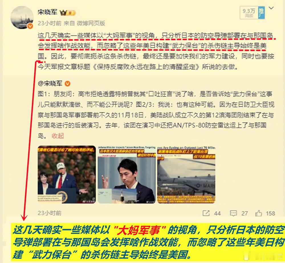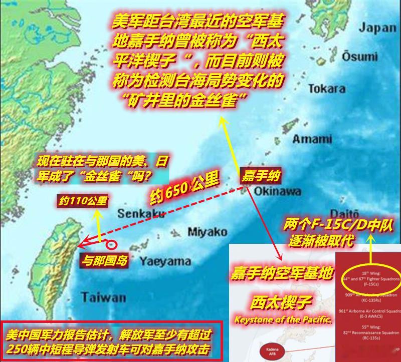 图1:有媒体朋友抱怨我昨天在微博里又提“大妈军事”一词;图2:我半开玩笑滴说,用真正有技术含量的“大妈军事”去分析与那国的日美军部署,撑死了就是个距离更近的“金丝雀”而已。因按传统有技术含量的“大妈军事”模式分析,台海周边1000公里范围内,大陆机场的容量是日本的六倍多(固定掩体更多),所以日、美一旦军事介入台海,与那国分分钟就会被抹平。更别说非传统的“大妈军事”分析了——早已按30万个联网传感器把台海1000公里范围内的所有目标都网格化锁定、然后用数千加攻击无人机就可搞定来说事了。