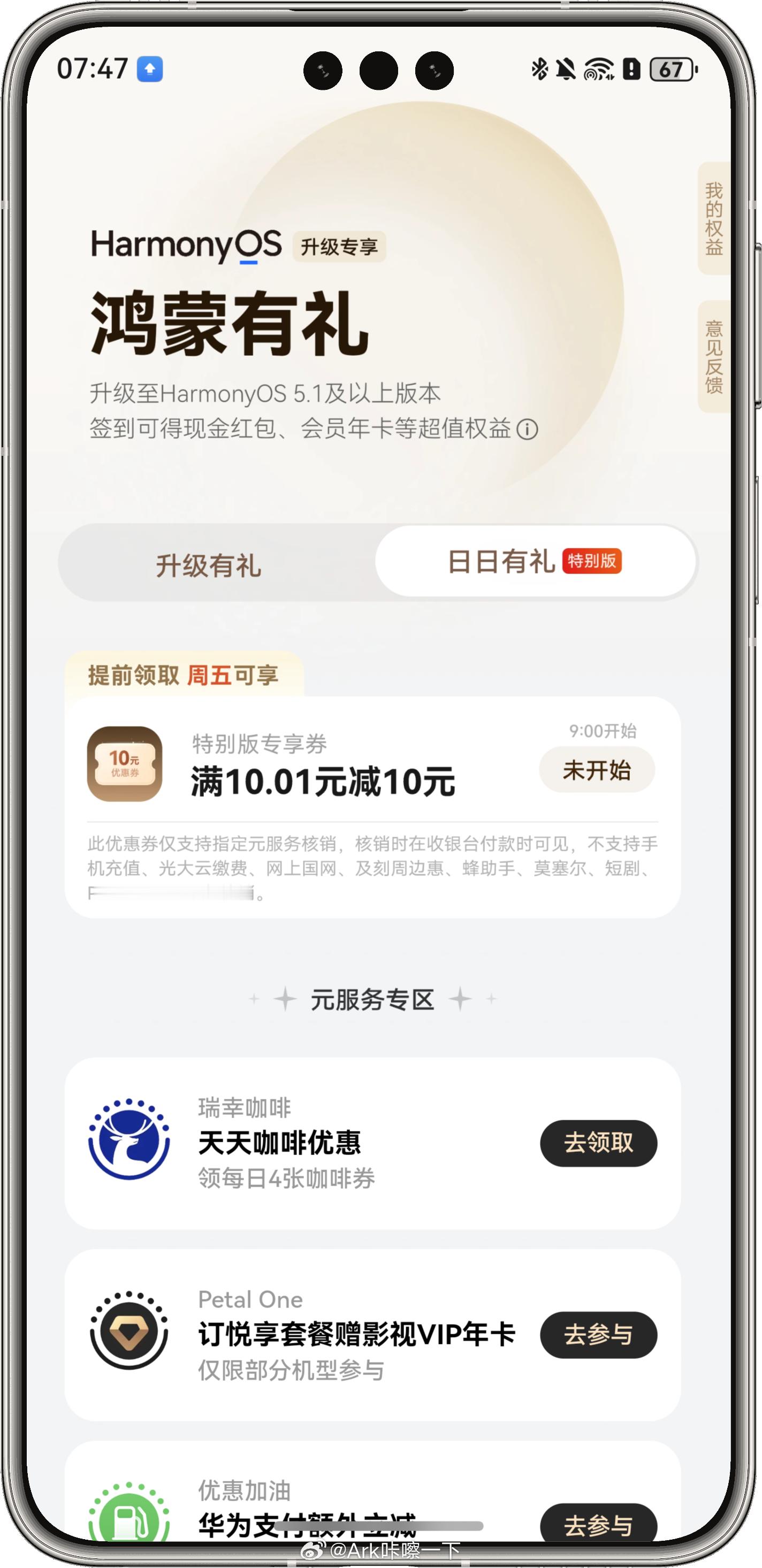 早鸭!今天鸿蒙6签到有10元元服务券,大家别忘了