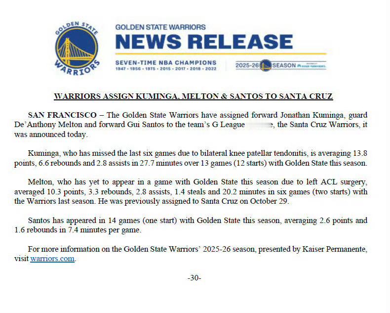 终于看到梅尔顿的消息了!勇士官方宣布将库明加、梅尔顿和桑托斯下放到发展联盟圣克鲁勇士队!目的是让他们今天能和发展联盟球队一起进行分组对抗。库明加和梅尔顿正在伤病恢复的后期阶段,桑托斯则是为了进行一些体能训练。分组对抗完成后他们都会被召回。金州勇士