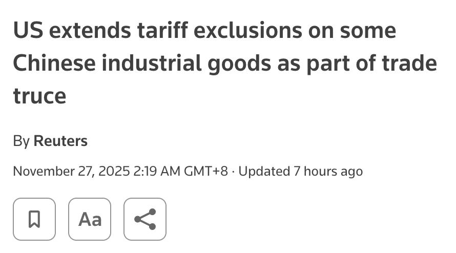 外媒:美国于2025年11月26日宣布,将对中国部分工业和医疗进口商品的关税豁免