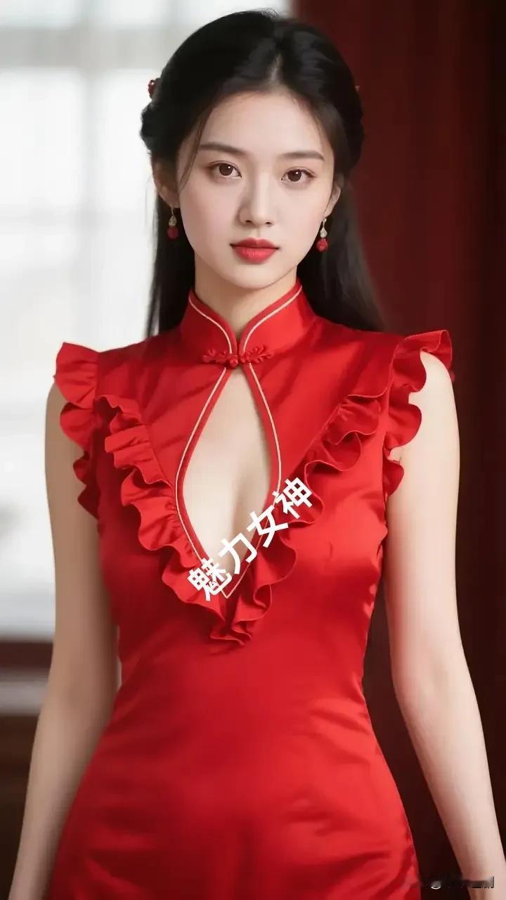一袭红缎旗袍,荷叶边点缀出别样风情,盘扣与剪裁间尽是东方韵味,她似从旧时光中走来,将古典雅致与现代妩媚融于一身,在岁月里绽放独特的魅力女神光彩。