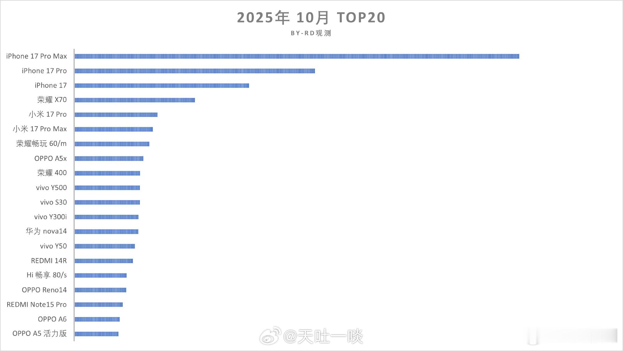 还是“17”强,10月单品销量榜出炉1、10月份单品销量前三被iPhone 17系列包揽,只能说太强了。根本找不到任何对手;2、荣耀X70这款机型可以封神了,安卓阵营排名第一,整体排名第四;3、第五、第六是小米17 Pro系列,这两款机型也是10月份单品销量唯二上榜的安卓旗舰。友商同档机型无一上榜;4、剩下的机型大家自己看。PS:前六机型命名都有“7”看来今年带“7”的都会火啊!