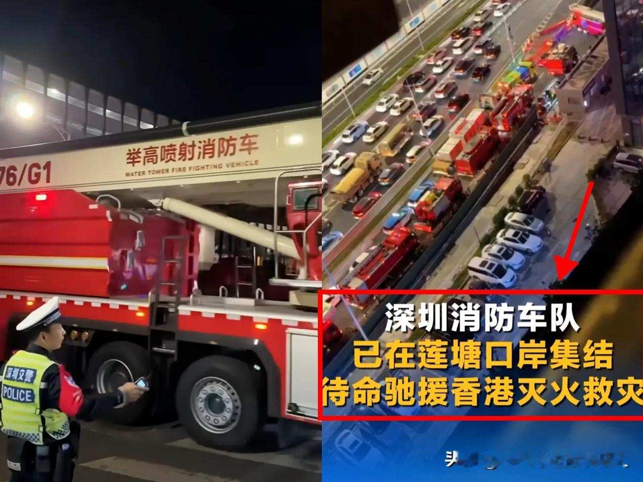 香港火灾暖心的一幕 深圳消防去口岸集结了 但是,香港那边还不打算请求支援 香港大埔宏福苑的火光牵动着所有人的心,这场五级火灾蔓延至7幢大厦,已造成44人遇难的沉痛后果,香港消防全员出动,700余名救援人员顶着高温与明火展开搜救,这样的场景让每个关注者都揪紧了心。 而另一边,深圳消防车队深夜集结莲塘口岸的画面,成了这场灾难中最暖心的注脚。没有高调的宣言,只有整齐排列的消防车和随时待命的救援人员,哪怕香港暂时无需支援,他们也选择提前就位——毕竟灾情面前,一分钟都可能关乎生命,与其等命令再行动,不如提前站在离危险最近的地方。 很多人会疑惑,为什么不直接跨境支援?其实救援从不是人多就管用,老旧屋邨的道路、燃烧后的建筑结构,都决定了作业空间有限,盲目投入反而可能影响现场秩序。深圳消防的“备而不用”,恰恰体现了专业与默契,这不是形式主义,而是对生命最负责的预判。 更让人动容的是,这种待命早已不是第一次。之前粤港澳大湾区的跨境救援演练,早就打通了“绿色通道”,三地消防早就练过协同作战的默契。这次深圳的主动集结,不过是把演练中的流程落到了实处,把“一方有难,八方支援”的道理,变成了看得见的行动。 有人说希望用无人机救火,想法很美好,但当下最靠谱的还是这种实打实的准备。香港有专业的救援力量,深圳有随时驰援的诚意,这种“你全力应对,我随时兜底”的状态,正是大湾区共同体最生动的体现。地域有界,但生命无界,救援的默契从来都不在于是否真的出动,而在于无论何时,我都在你身边。 这场灾难里,我们看到了香港市民自发当义工运送物资的善良,看到了救援人员逆行的勇敢,更看到了深港之间无需言说的守望。你觉得这种跨境救援的默契,是不是大湾区最珍贵的财富?如果是你,会为这份待命的诚意点个赞吗?