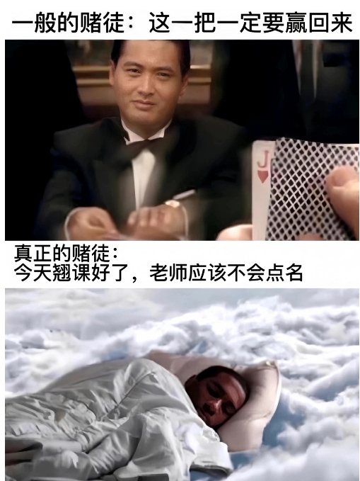一般的赌徒:这一把一定要赢回来 真正的赌徒:今天翘课好了,老师应该不会点名