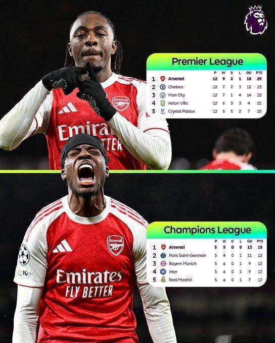 阿森纳本赛季目前为止的表现:▪️送给拜仁本赛季欧冠首败▪️目前欧冠唯一一支保持不败的球队▪️领跑英超积分榜阿森纳3比1拜仁