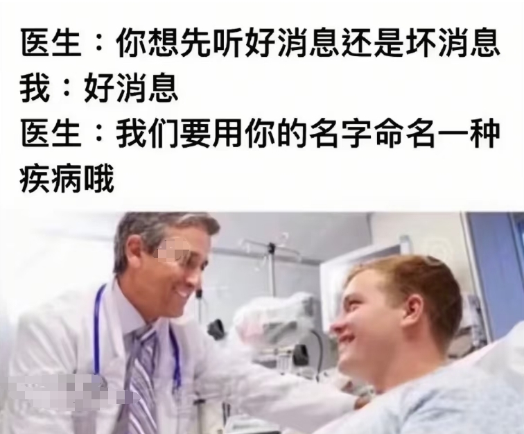 医生:你想先听好消息还是坏消息 我:好消息 医生:我们要用你的名字命名一种疾病哦