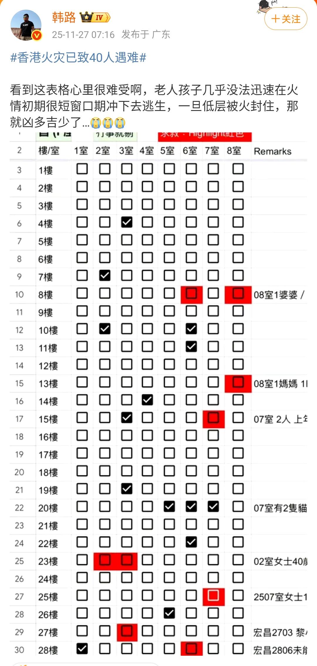 韩路:看到这表格心里很难受啊,老人孩子几乎没法迅速在火情初期很短窗口期冲下去逃生,一旦低层被火封住,那就凶多吉少了…[流泪][流泪][流泪] 小编在这里呼吁大家,在家庭也要配备灭火器,以及那种简易的呼吸装置,现在很多新建的小区,消防做的都非常好了,比如说消防栓和灭火器都有配置,但是家庭里面并没有配备消防毯和简易呼吸器。 在这次事件中大家也能看出来,一旦被困出是出不去的,所以就要在房间里躲起来,等待消防员搜救。 各位是怎么看的?欢迎评论区留言。