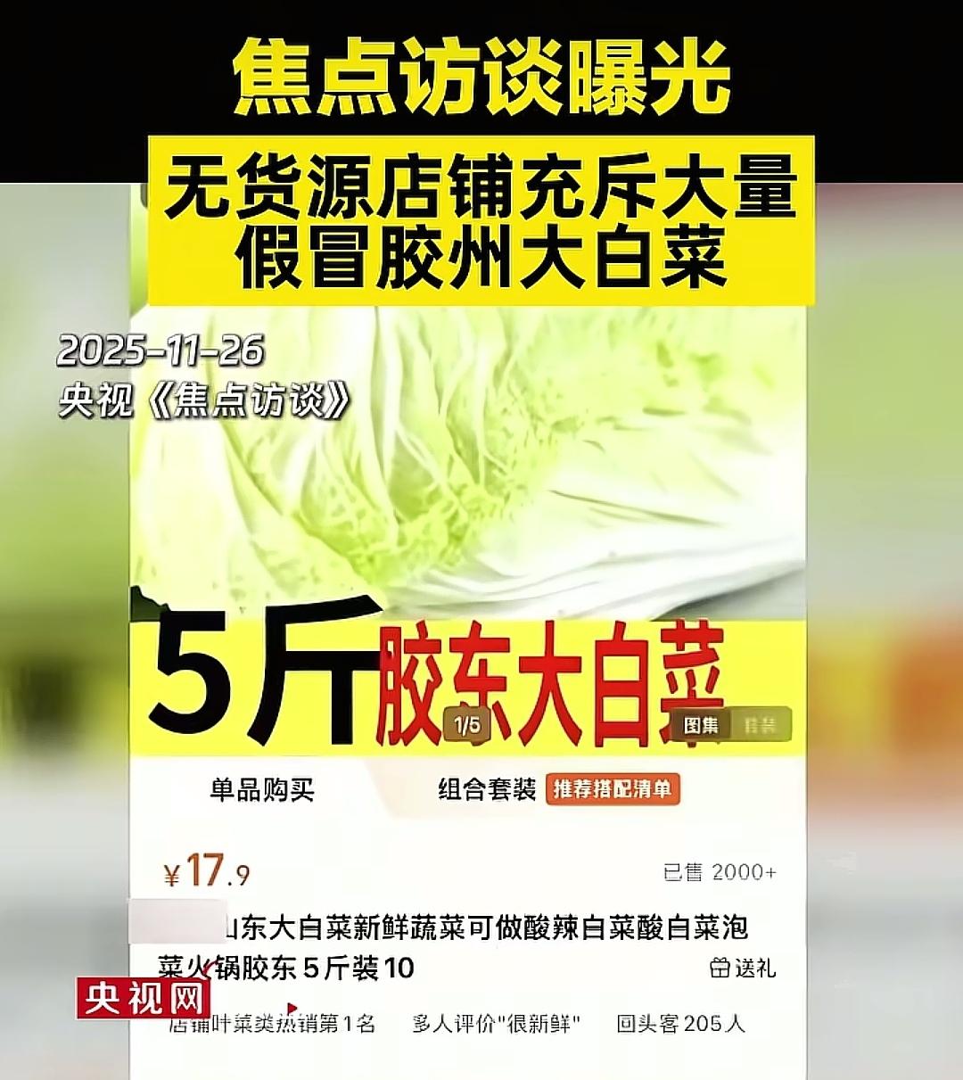 155元一颗的假冒胶州大白菜上焦点访谈了!山东网友表示作为一个土生土长的胶州人,我都没吃过正宗的胶州大白菜,你们去哪吃,当然,如果你们把从胶州的地里种出来的白菜叫胶州大白菜,那就当我没说。我们胶州本地,真正的胶州大白菜没几亩地,就像烟台苹果一样。 反正自从有电商,哪个地方得某个东西出名了,然后所有买这个东西的基本都打着某地的名号,如五常大米、宁夏中宁枸杞、静宁苹果、阿克苏苹果、阳澄湖大闸蟹等等。 咱就说,这又是谁的部将,无货源敢做生鲜类,一手商家都不敢做生鲜类了,售后成本都比货物本身成本要高。 还有广西网友留言,现在大部分的砂糖橘,现在网上很多打着广西砂糖橘的名字的都是假的,因为我们本地的砂糖橘上市时间大概要到元旦左右才上市,所以请各大网友甄别。 再就我自己的经历,买了个置物架,某京,某宝,价格一个200多,一个400多,买回来看看那个质量好留哪个,结果是同一款产品同一个商家,同一个发货人。不知道你们有没有这种经历? 无货源发货没办法,维权过程长成本高违法成本低,又是暴利,不赚白不赚,有些人就铤而走险了。