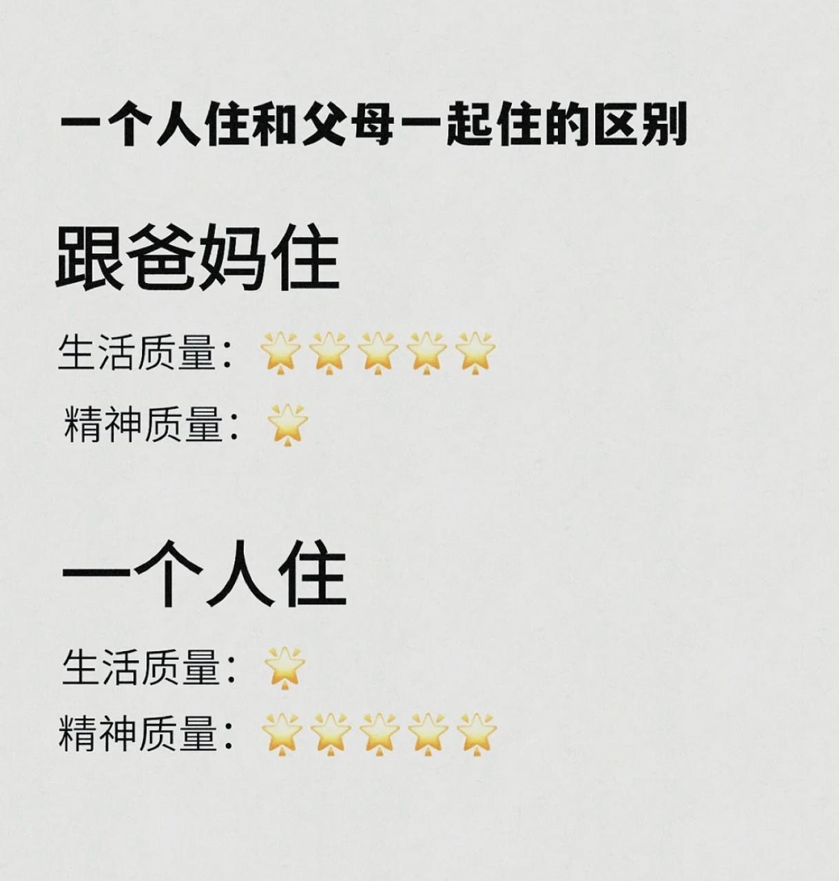 【一个人住和爸妈一起住的区别】 一个人要做饭,和爸妈住吃现成。 一个人随便带人来,和爸妈住会被盘问。 一个人要搞卫生,和爸妈住可以偷懒。 还有什么区别呢?在线等!