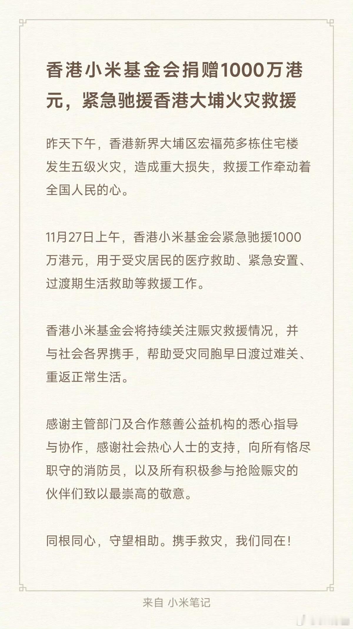 小米这次反应是真快!虽然我也不知道香港是否需要“八方支援”,昨晚深圳集结的消防车好像最后也没开过去,但是无论如何,勿以善小而不为,何况这是1000万呢。给小米点个赞香港小米基金会捐赠1000万港元