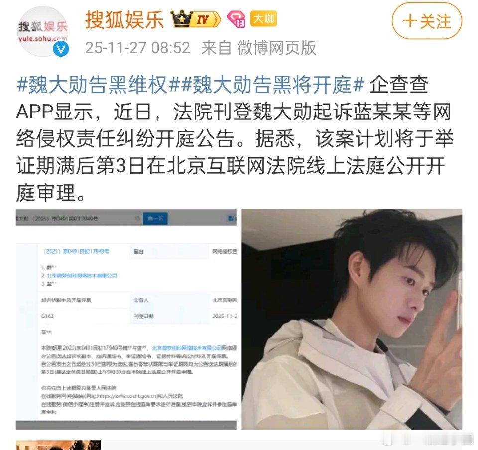 魏大勋告黑告黑要开庭了,维权真的是个漫长的过程!加油,支持大勋维权
