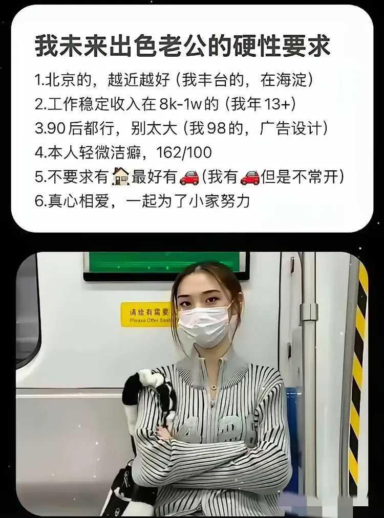 这个女子也应该算是人间清醒了。 她没有像现在许多女子那样,征婚要求彩礼多少,五金多少,要车要房。 她只提简单的要求,如年龄相差不太大,收入甚至比她低一点都可以,也不要求有房。关键是真心相爱,一起为小家努力。 讲句实话,像这样不一味追求物质的女子,的确不多。 遇上这样的女子,还犹豫什么?赶紧娶了。