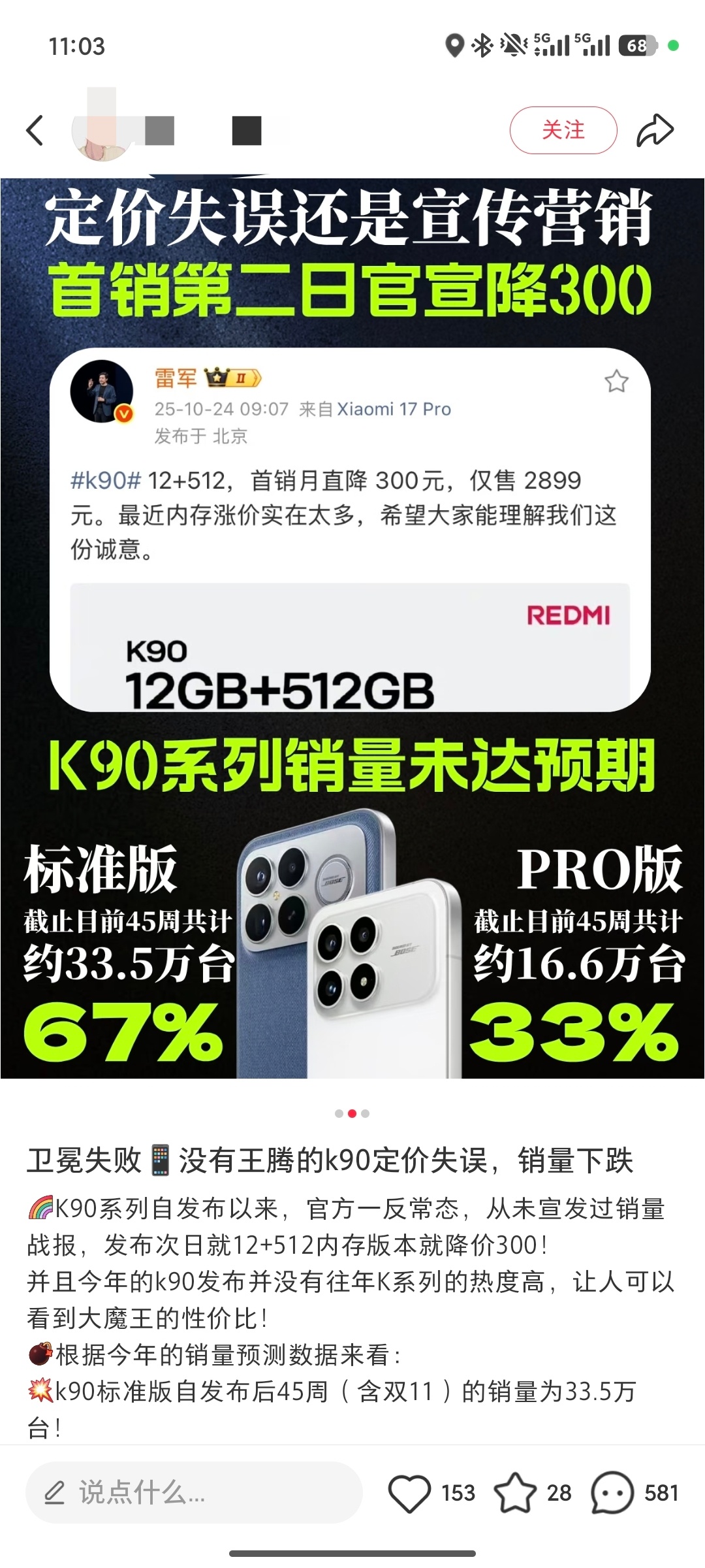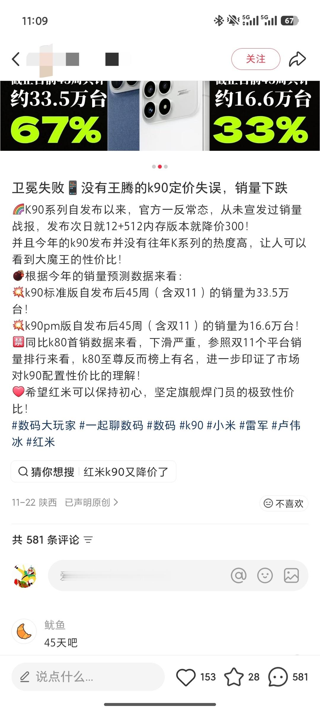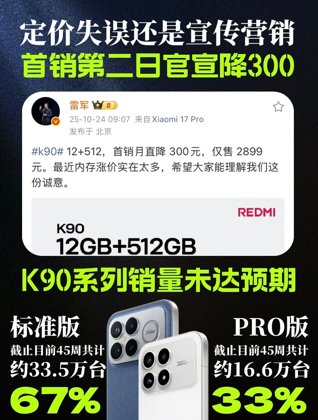 究竟目前REDMI K90的销量数据如何?刚刷到一个博主,说K90卖了33.5万台,K90 Pro系列16.6万台,加起来大概50.1万台,目前上市45天。比较搞笑的是题目,离开了王腾的K90定价失误,销量下跌首先它这个销量,下方又说是预测销量,不知道哪来的数据。其次,我不太相信,REDMI手机的销量,会与王腾直接挂钩,或者说关联如此大。第三,K90系列销量恐怕确实低于K80,毕竟K80去年10天破百万实在是太牛了。今年K90的12+512版本,确实出现了第二天就官宣首月销售降价300的决定,可以看出来预定和首销,应该是确实压力有点大。刚看了下,目前这个版本依然是降价300再销售。不过我认为,除了存储涨价之外,目前国补难以申请到,以及外部竞争更加白热化,也是K90销量受影响的原因。不过数据还是以官方为准,这种猜测的数据个人判断也是不准确的。k90k90promax