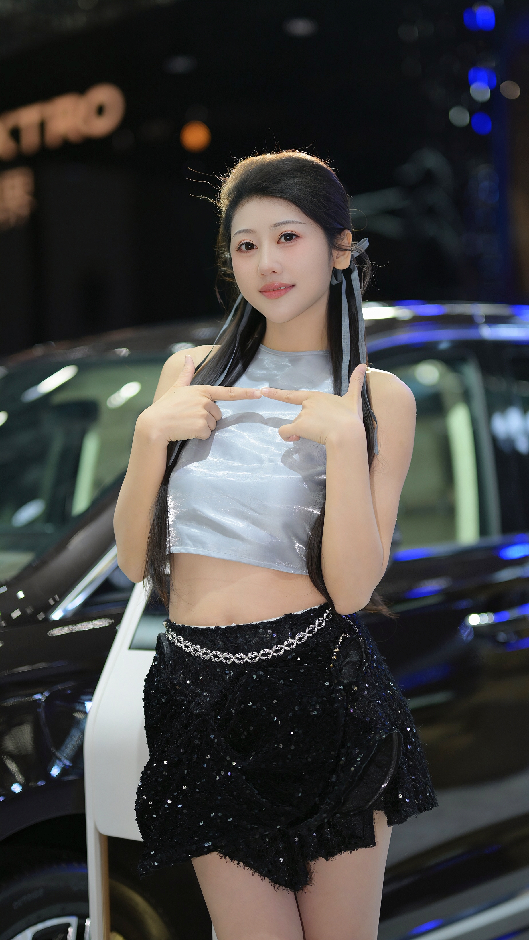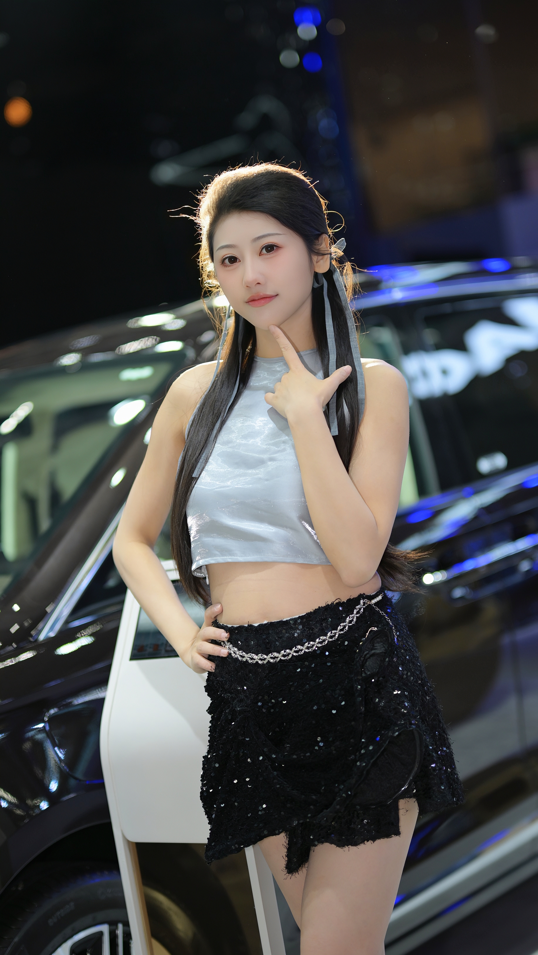 2025上海车展车模任绵绵 一个好看的小姐姐, 穿的白底带蓝花的改良旗...