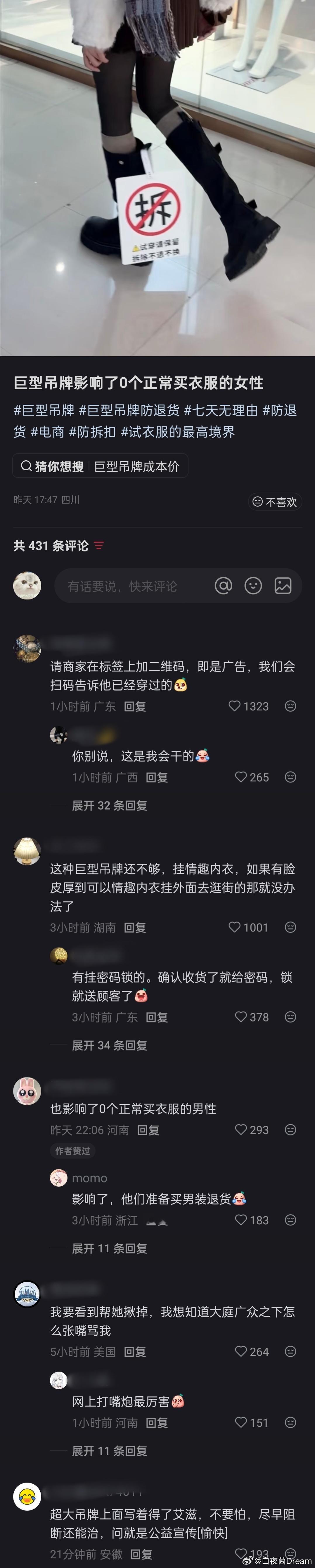 网友:巨型吊牌影响了0个正常买衣服的女性