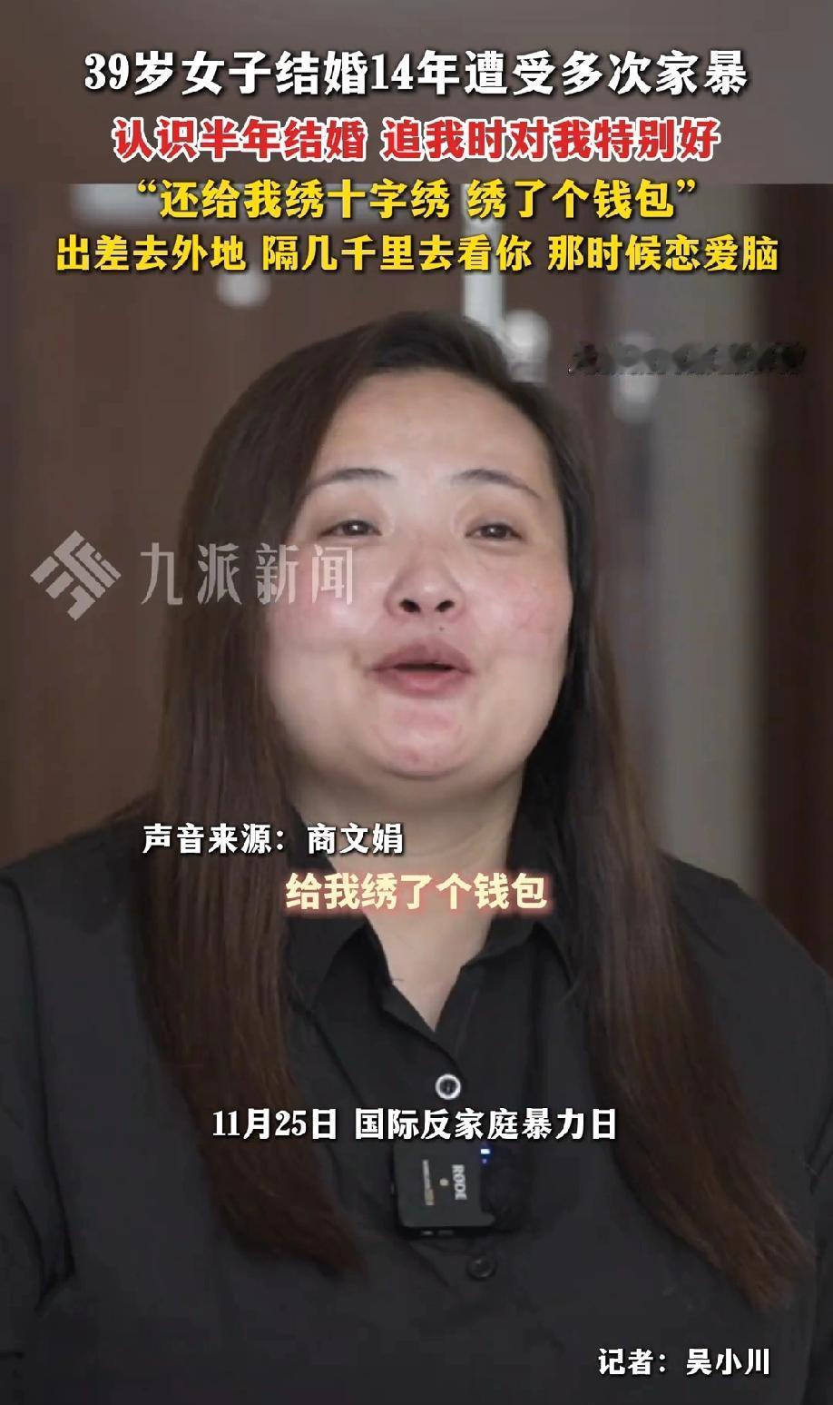 一39岁女子,14年前跟认识不到半年的男子步入婚姻,本以为会是幸福的开始,却没想到男子结婚后就像变了一个人…… (来源:九派新闻) 39岁的商文娟坐在镜头前,回忆起过去,语气里满是唏嘘。她怎么也没想到,那个曾为她绣十字绣钱包、隔着几千里路去看她的男人,会把自己拖入14年的家暴深渊。 认识才半年,商文娟就被这个男人的温柔攻势打动了。那时候的他,对她特别好,亲手绣了个十字绣钱包,上面还绣着她的名字。 他出差去外地,哪怕隔了几千里路,也会特意跑来看她。商文娟那时就是个恋爱脑,觉得这男人浪漫又深情,认定和他结婚就能有个温暖的家,于是毫不犹豫地嫁了。 可婚后的生活,和她想象的天差地别。那个绣十字绣的手,渐渐变成了挥向她的拳头。一次又一次的家暴,像一把把刀,割碎了她对婚姻的所有幻想。 她不是没反抗过,可每次换来的不是道歉和改变,而是变本加厉的暴力。 商文娟的故事,是对所有恋爱脑女性的一记警钟。恋爱时的甜言蜜语和小恩小惠,可能只是施暴者的伪装。 家暴只有零次和无数次,千万不要因为一时的感动就忽略了对方潜在的暴力倾向。 要明白,一个人的人品不能只看他恋爱时的表现,更要观察他在压力下、在不顺时的情绪管理和行为模式,那些能控制住自己情绪和行为的人,才是值得托付的。 同时,我们也要看到,家暴受害者往往陷入“为了孩子”“他会改”的自我欺骗中。但事实是,隐忍换不来尊重,只有勇敢站出来,用法律武器保护自己,才能真正逃离噩梦。 孩子在充满暴力的家庭环境中成长,受到的伤害可能比父母离婚更大,一个健康的单亲家庭,远胜过一个充斥着暴力的完整家庭。