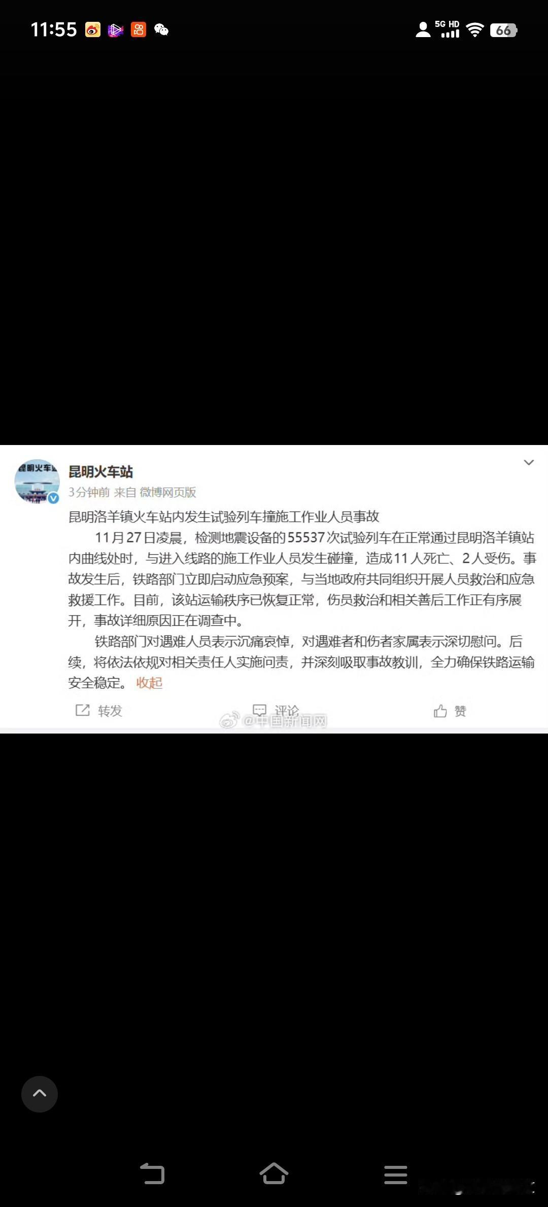 昆明火车站突发悲剧!试验列车撞人致 11 死 2 伤😱 11 月 27 日凌晨,检测地震设备的 55537 次试验列车在正常通过昆明洛羊镇站内曲线处时,竟与进入线路的施工作业人员发生碰撞,造成 11 人死亡、2 人受伤的惨痛悲剧! 事故发生后,铁路部门迅速行动,立即启动应急预案,与当地政府携手开展人员救治和应急救援工作。目前,该站运输秩序已恢复正常,伤员救治和善后工作正有序推进,事故详细原因也在紧锣密鼓调查中。 铁路部门对遇难人员致以沉痛哀悼,对遇难者和伤者家属表示深切慰问🙏。后续将依法依规问责相关责任人,深刻吸取教训,全力保障铁路运输安全稳定。大家一起关注后续进展,愿逝者安息🕯️。 火车站事故 昆明车撞人事件