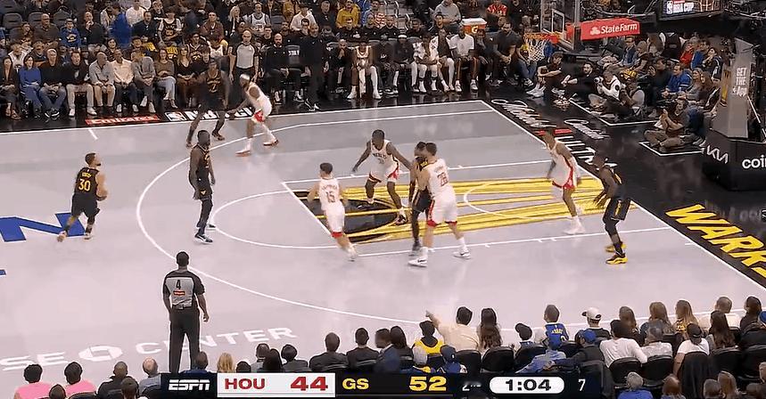 真准!库里弧顶三分稳稳命中! 在今天NBA季中锦标赛勇士对阵火箭的第二节比赛中,库里利用无球跑位成功甩开防守球员后弧顶超远三分稳稳命中,帮助勇士将分差扩大至11分。 让库里在弧顶获得这么大的出手空间,这跟白送三分没任何差别!火箭这个防守回合太失败了!