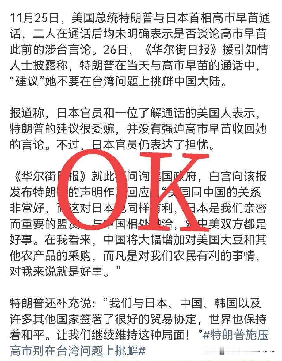 最新情报! 特朗普和“搞事”的高市的通话内容解密了?据《华尔街日报》援引知情人士披露称,特朗普在当天与高市早苗的通话中,“建议”她不要在台湾问题上挑衅中国大陆! 也就是说两个人的通话,确实谈到了高市早苗的错误言论,特朗普也对她进行了批评教育,如果接下来高市再不听话,以特朗普的个性,怎么也得给日本一点颜色看看吧?毕竟孰轻孰重,特朗普心里账本清楚的很![捂脸]