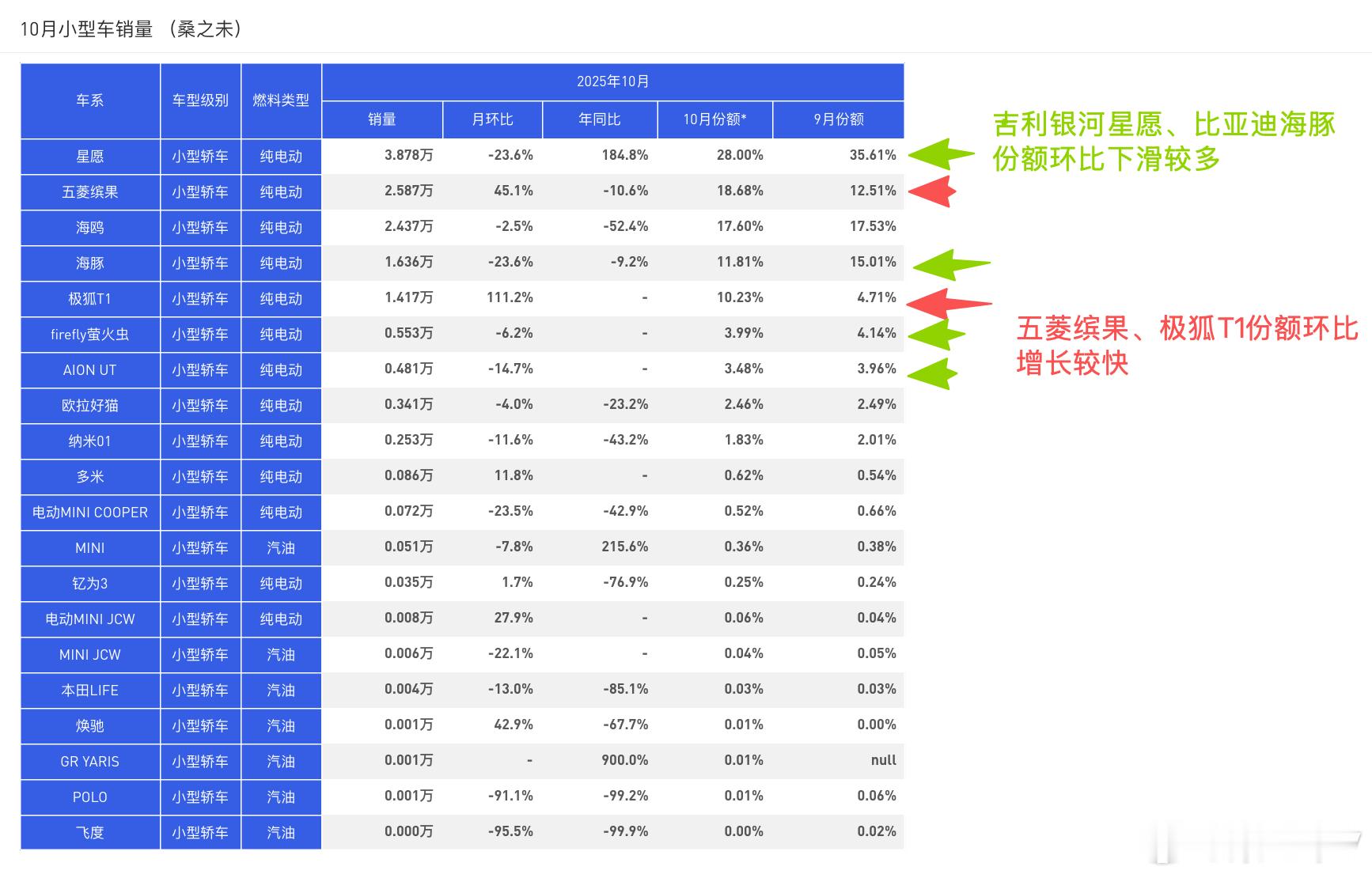 极狐T1上市两个月,已经在小型车市场份额突破10%10月,小型车市场销售13.8万辆,环比下滑2.8%,同比增长10%。10月小型车市场销量下滑主要是受部分地区购车补贴暂停有关,极狐T1、五菱缤果销量快速提升,对同级别市场竞品产生压力,银河星愿、比亚迪海豚市场份额下滑幅度较大。桑之未汽车行业观察