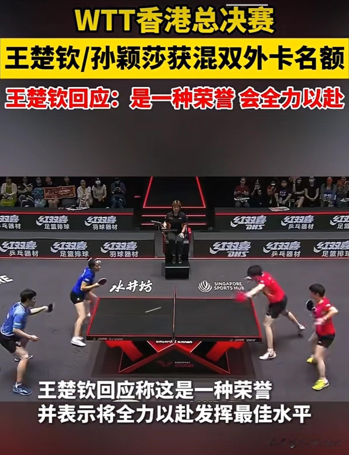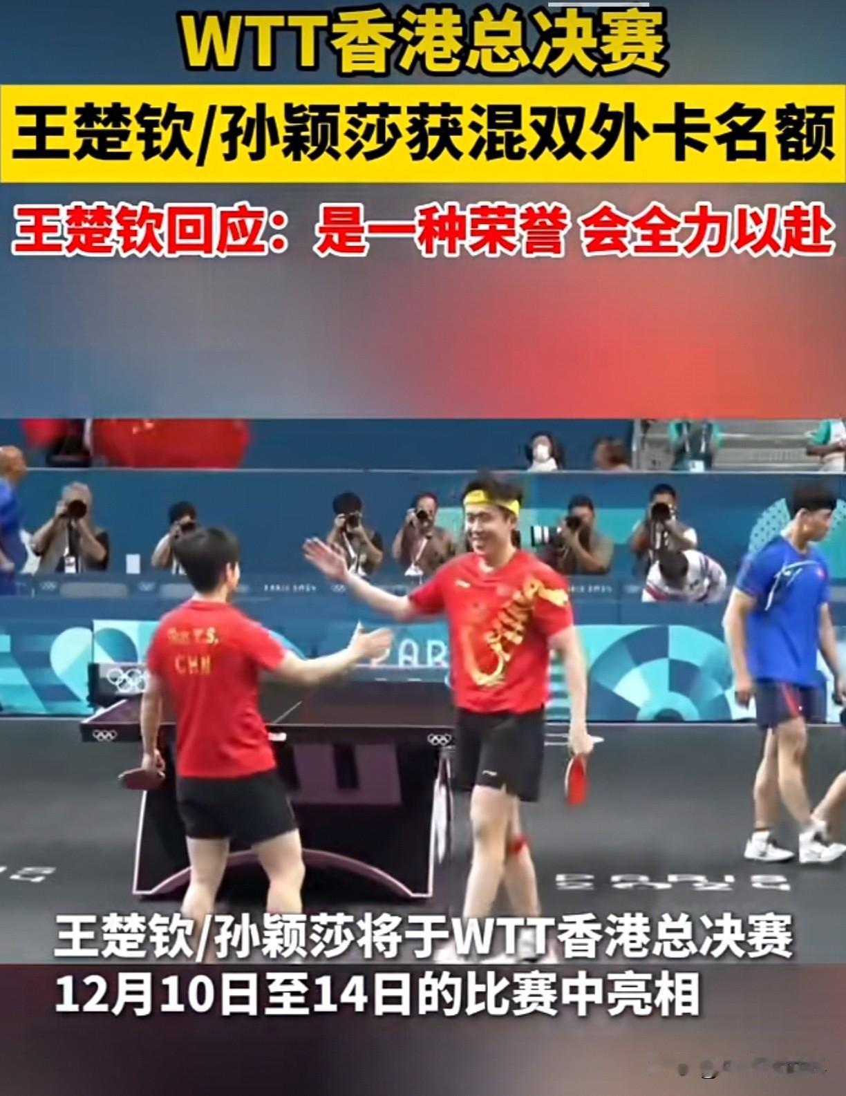 薯条派有福啦!喜欢莎莎楚钦的所有人都有福啦! 最新消息,王楚钦孙颖莎获WTT香港总决赛混双外卡,这也意味着我们又可以看到他们的混双比赛了! 12月10-14日,他们除了单打比赛,也会参加混双比赛。 按照规则,他们实际上没有达到直通的标准,因为今年混双搭的很少,是选择性参赛,所以要参加混双比赛,只能采用这种外卡的方式了。 很多人心疼他们像生产队的驴子一样,有干不完的活。这不,成都混合国际比赛还没开打,香港WTT总决赛又在向他们招手了。 既开心能看到他们的混双比赛,又心疼他们不是在比赛就是在比赛路上,太累了! 本来洛奥周期他们应该把重心放单打比赛上,但种种因素还不允许他们轻装上阵。唉…… 赛场是他们的战场,家国是他们的信仰,莎莎楚钦用拼搏与坚守 ,书写新时代国乒运动员的家国担当。友友,你喜欢这样的他们吗?