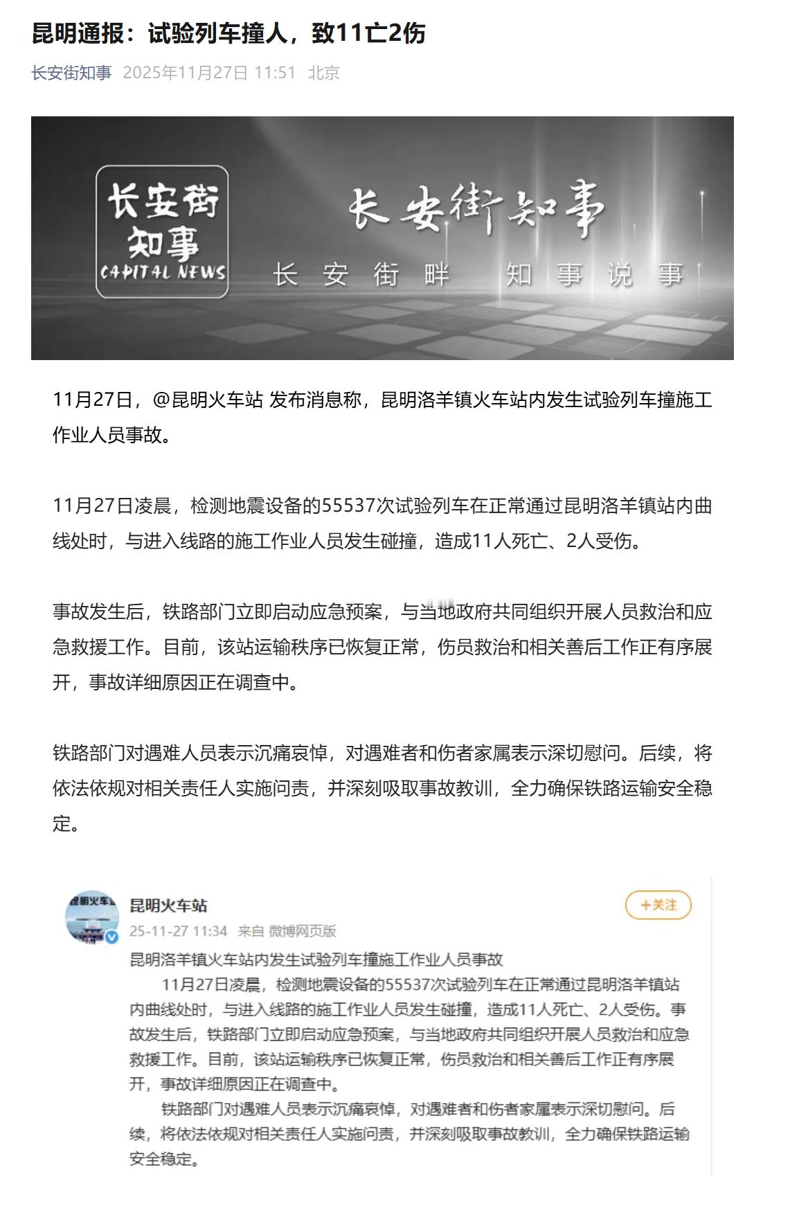【昆明一火车站试验列车撞人致11死 】这已经是重大安全事故了。。