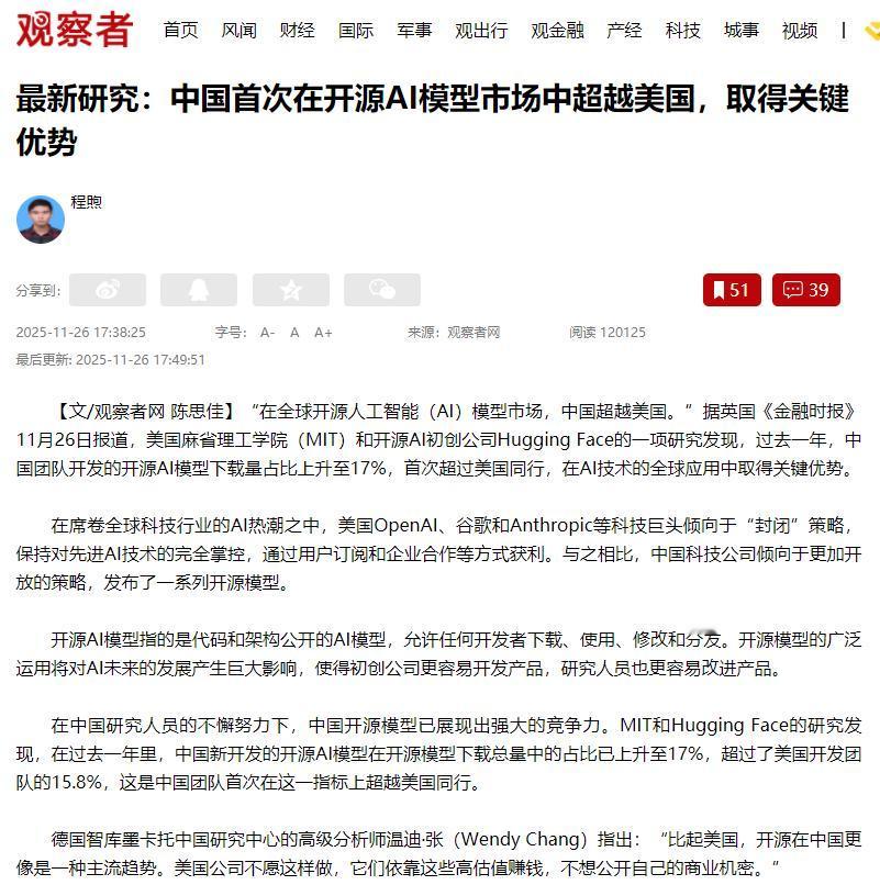 中国首次在这一领域超越美国! 2025年11月26日,MIT与Hugging Face的研究炸翻科技圈:中国开源AI模型下载量占比冲至17%,反超美国的15.8%。更颠覆的是,这是在美国芯片封锁的高压下实现的,Z.ai、DeepSeek等模型用低成本跑出顶尖性能,让硅谷都慌了神。 这种优势不是偶然的市场波动,而是政策引导、人才培养、场景落地和技术治理多方面协同发力的结果,和单纯的技术竞赛有着本质区别。 这背后最核心的推力,离不开国家层面的顶层设计与政策赋能。国务院早在今年8月就针对性发布相关意见,不仅明确提出要扶持人工智能开源社区发展,还要求搭建开源贡献的评价体系与激励机制,更推动高校将开源成果纳入学生学分与教师考核指标,从制度上为开源生态筑牢了根基。 这意味着开源不再是企业的自发选择,而是有国家层面政策背书和资源倾斜的发展方向。 这种制度性支持让开发者、高校和企业形成了合力,不用像美国那样靠政府呼吁企业被动参与,自然能催生出更活跃的开源生态。 人才供给的系统性更是让优势有了底气。华中科技大学和百度合作的“飞桨班”就是个典型例子,这种“课堂+课外+实习+竞赛”的四维培养模式,把企业真实项目和开源社区资源直接搬进课堂,学生一边学理论一边打磨实际产品,还能去百度总部和工程师并肩作战。 这种校企深度融合的培养方式,让中国开源开发者队伍不仅规模超220万,质量也同步提升,从根源上解决了开源生态的人才短板。 更让人意外的是,中国开源模型已经在细分领域扎下深根,不再局限于通用场景。 农业领域里,“天天学农”把DeepSeek做了私有化部署,既帮平台整合农业培训数据、定制课程,又能通过智能客服实时解答农户问题,让AI从云端真正走进田间地头。 这种贴近产业的落地能力,让开源模型不再是实验室里的技术演示,而是能创造实际价值的工具。相比之下,美国开源模型更多集中在通用技术层面,在垂直领域的渗透力明显不足。 值得关注的是,中国在开源AI的技术治理上也走在了前面。中国信通院今年已经开展了两轮针对性测试,一方面用15000多条测试数据检测代码大模型的安全风险,覆盖9种编程语言和13种攻击方法,就算是表现较好的模型安全通过率也能达到80%以上,面对常见攻击的拦截率接近八成。 另一方面还针对多模态模型的“幻觉”问题做了专项测评,摸清了行业普遍存在的短板。 这种提前建立标准、排查风险的做法,让中国开源生态既能快速发展,又能避免野蛮生长带来的隐患,比美国只重技术不重治理的模式更可持续。 反观美国,虽然也想推动“美国价值观”的开源模型,但缺乏政策、人才和场景的联动。 没有像中国这样的激励机制,独立开源团队数量不足;高校和企业的人才培养脱节,难以形成稳定的开发者梯队;再加上巨头更倾向于闭源盈利,开源生态始终处于分散状态。 OpenAI所谓的“开放权重”模型,连核心训练代码和数据都不公开,根本算不上真正的开源,也难以获得开发者的长期信任。 说到底,中国开源AI的超越,本质是“生态化发展”对“单一技术竞争”的胜利。 它不是靠某几个明星模型昙花一现,而是靠政策给方向、人才做支撑、场景验价值、治理保底线,形成了自我迭代的良性循环。 这种模式不仅让中国在AI领域打破了技术垄断,更提供了一种新的可能,让技术不再被少数企业掌控,而是通过开源共享,成为各行各业创新的基础设施。 未来,随着这套生态体系的不断完善,中国开源AI的影响力还会持续扩大,而这种“开放+规范”的发展理念,也终将成为全球AI产业的共识。