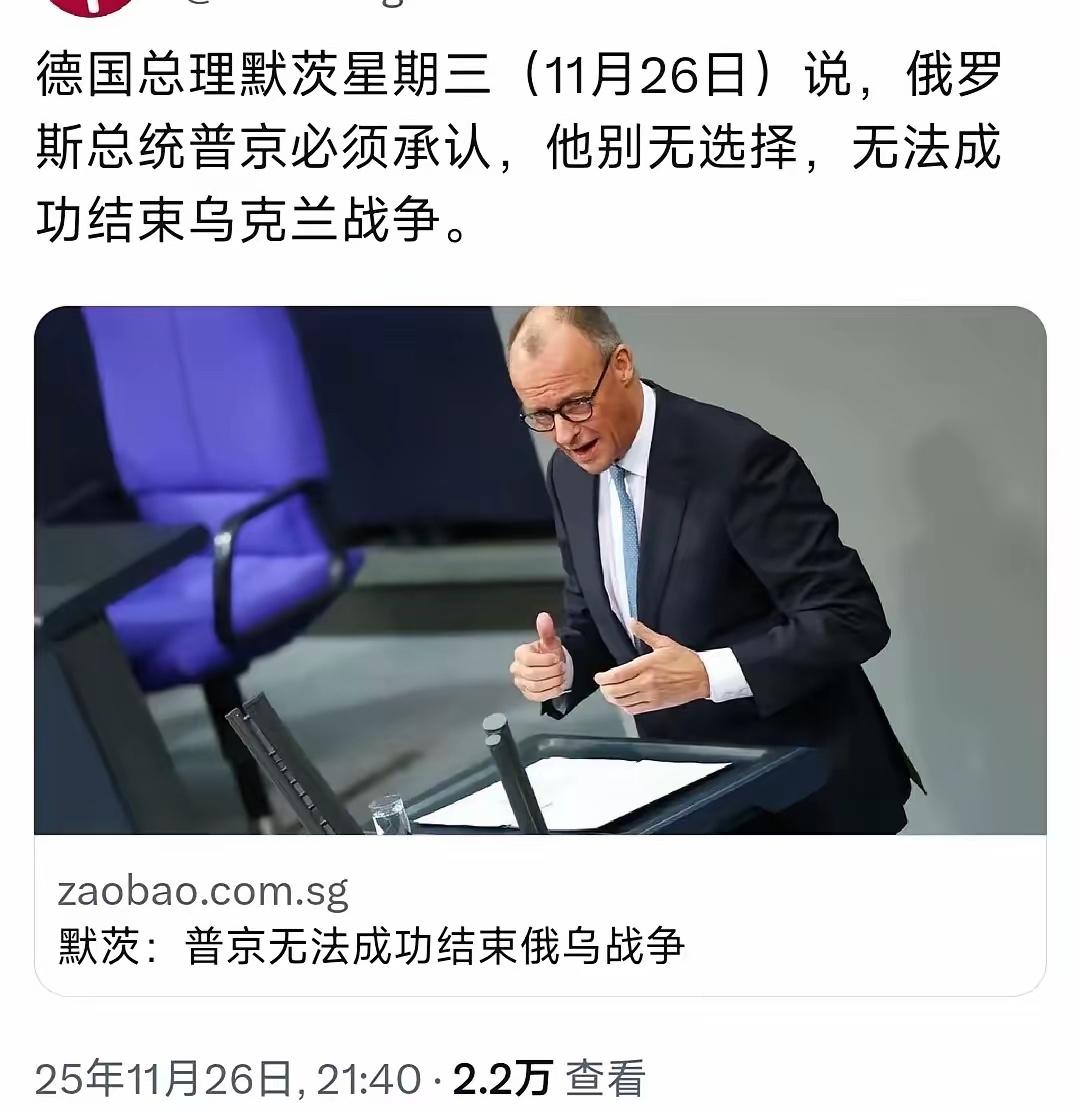 德国总理默茨称,俄罗斯总统普京必须承认,他别无选择,无法成功结束俄乌冲突! 德国作为二战的战败国,看来它好战的基因仍在,普京别无选择,他无法成功结束俄乌冲突,德国看来是很喜欢俄乌冲突现在这个状态,真是其心可诛啊! 按说目前状态,美国总统特朗普更想结束俄乌冲突,把美国该吃进去的利益赶紧吃进去,至于德国,如果普京也拿出《联合国宪章》的“敌国条款”,德国该如何应对?