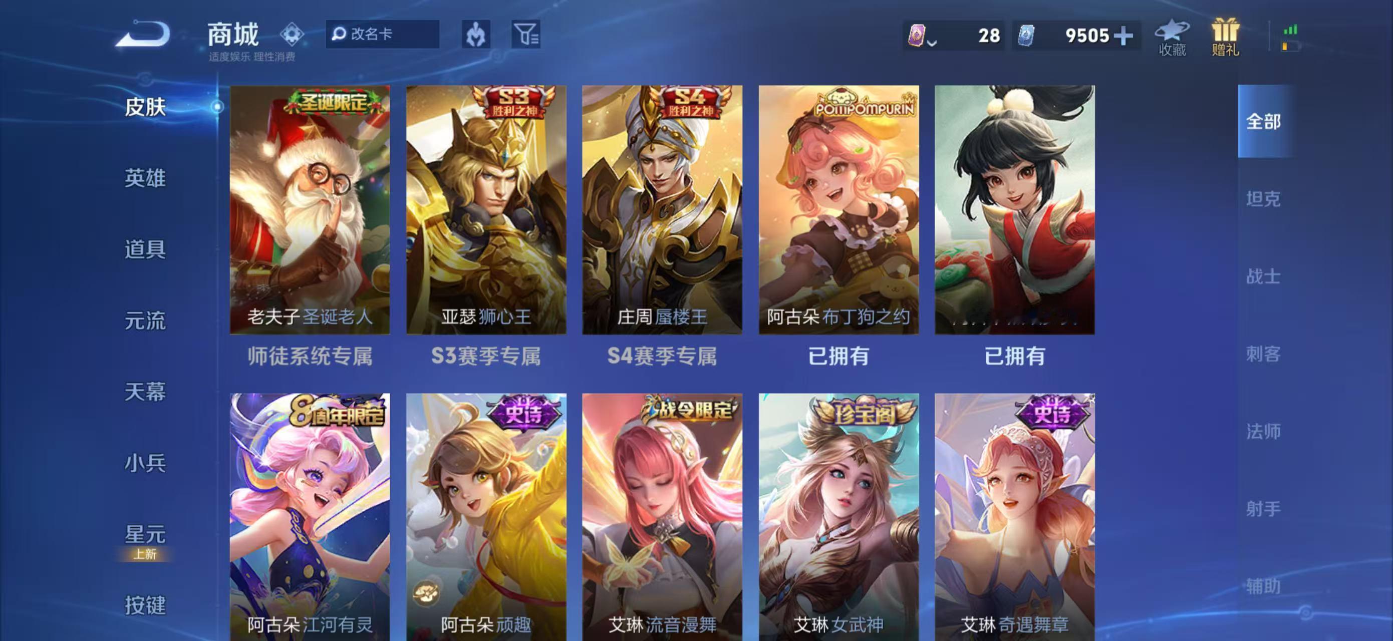 王者最难全皮肤的英雄目前就亚瑟和庄周的赛季皮肤,老夫子的圣诞老人,其他都有了!王者荣耀现在出皮肤的频率太高了,动不动就是传说无双,真吃不消了