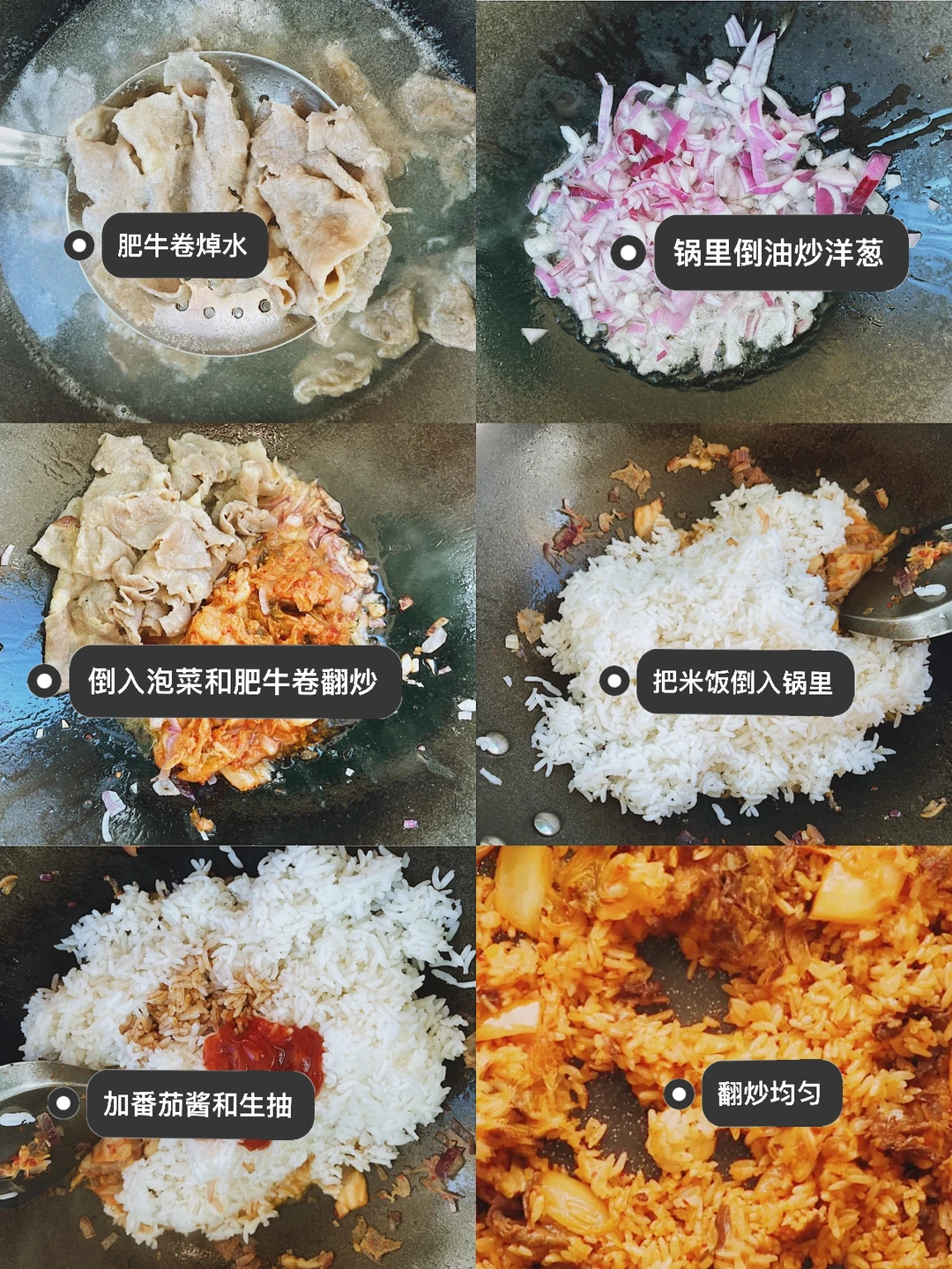 1️⃣肥牛卷放锅里焯水捞出备用,锅里倒入适量食用油,把洋葱碎炒香以后放泡菜和肥牛卷,翻炒出香
