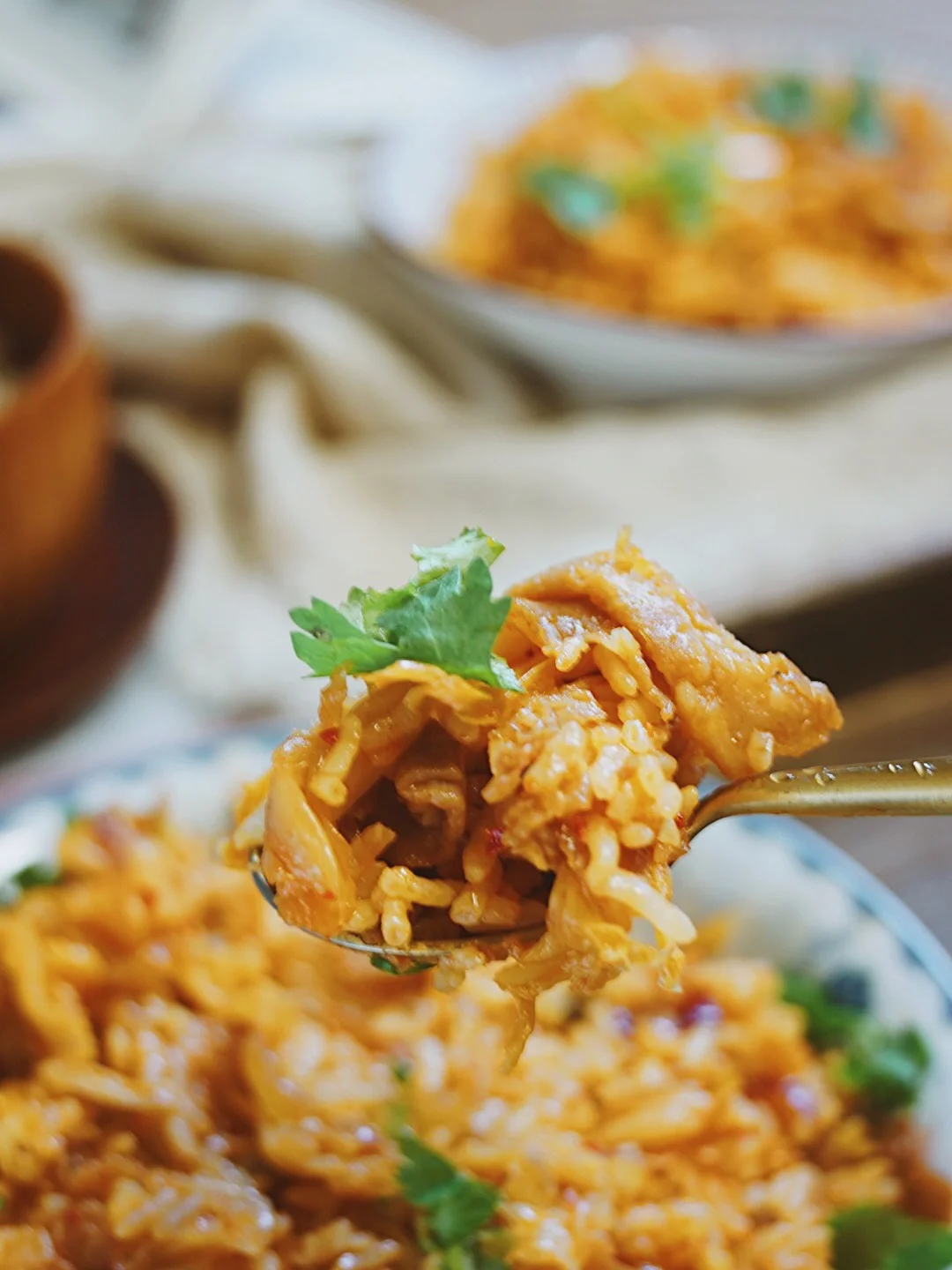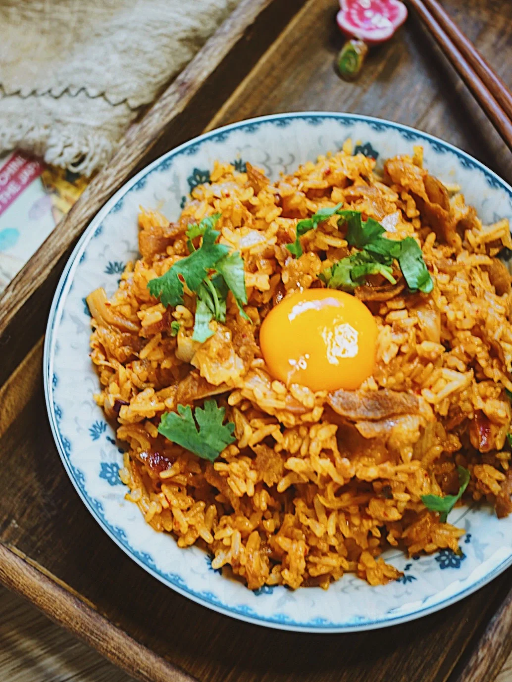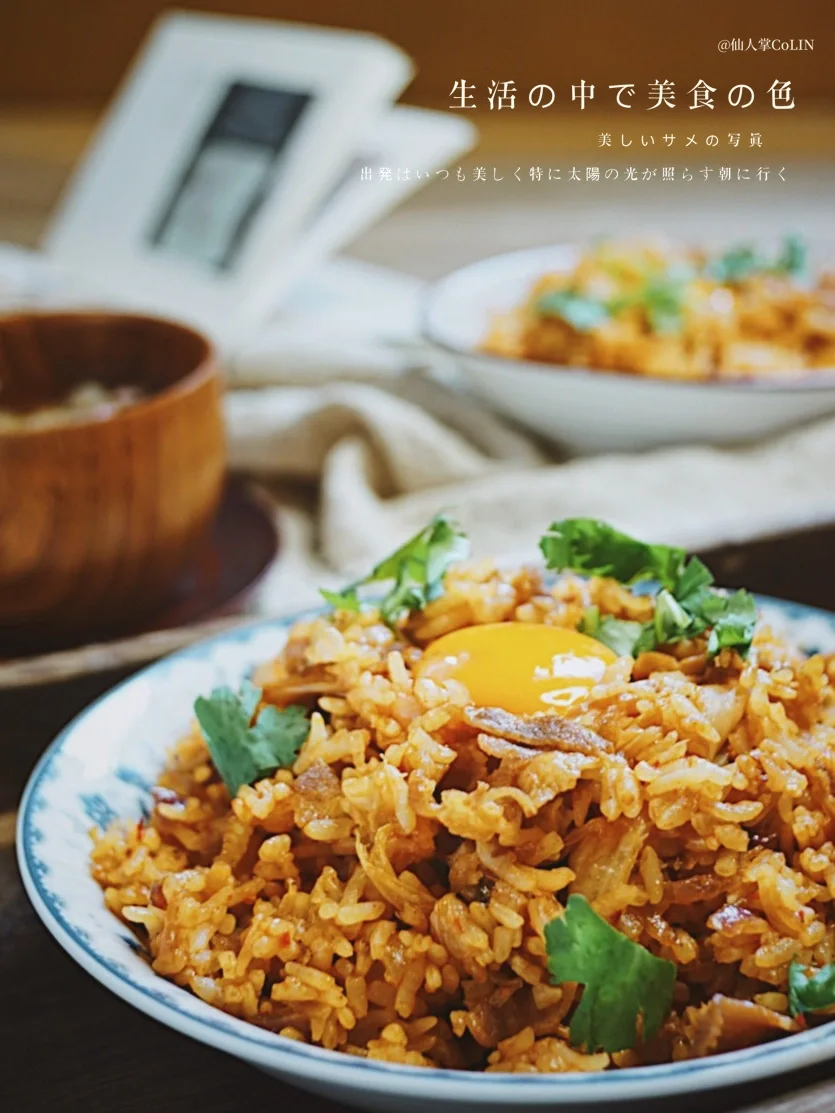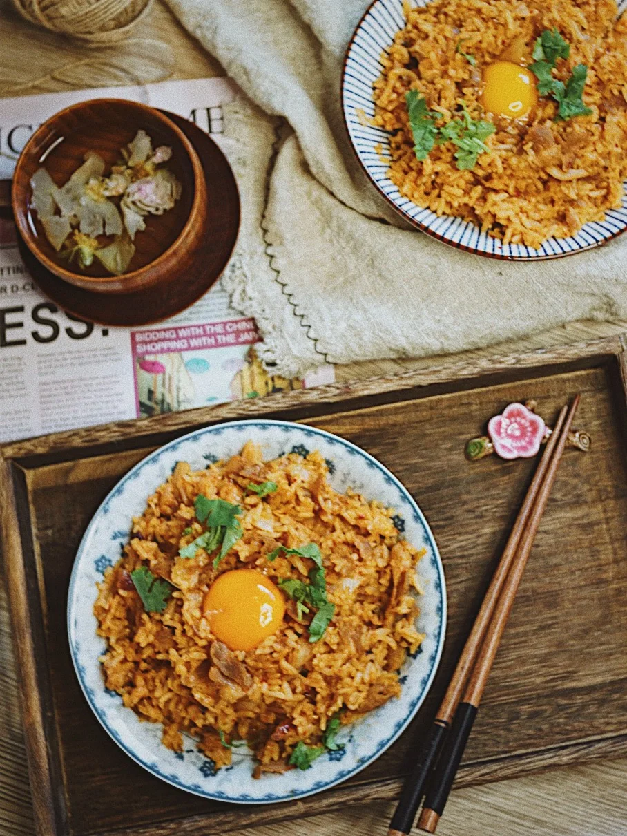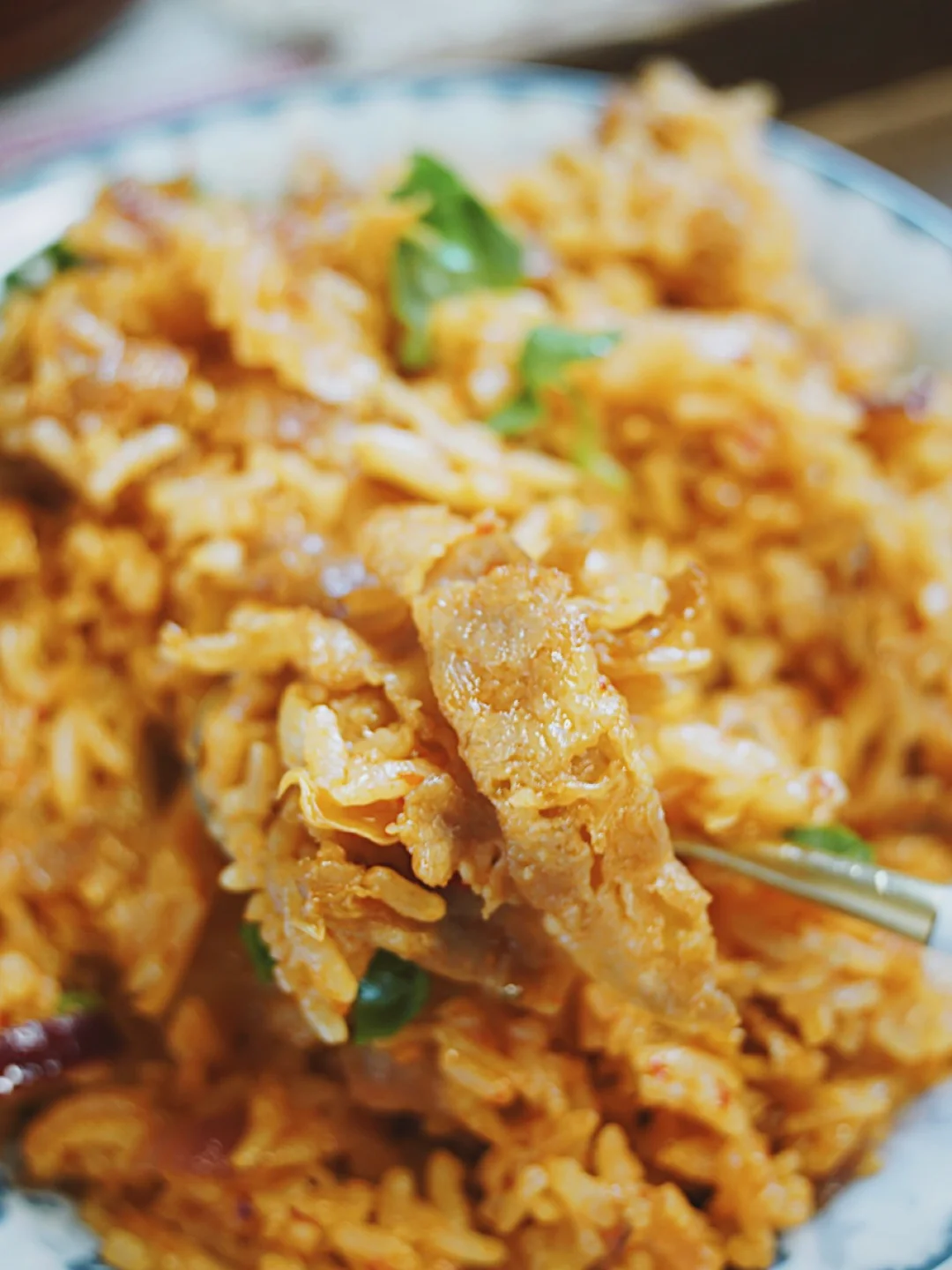 甜辣清脆的泡菜和鲜香软韧的肥牛卷,再米饭中翻炒,谁也没有夺取谁的风味。粒粒分明的米饭均匀的包裹住泡菜汁,顶部再打上一个温泉蛋