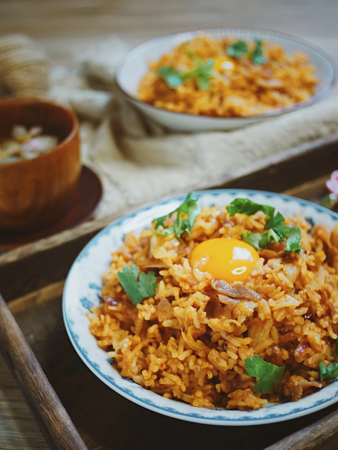 3️⃣出锅成盘,米饭的中间挖一个凹槽,打入无菌鸡蛋,撒上香菜或者香葱