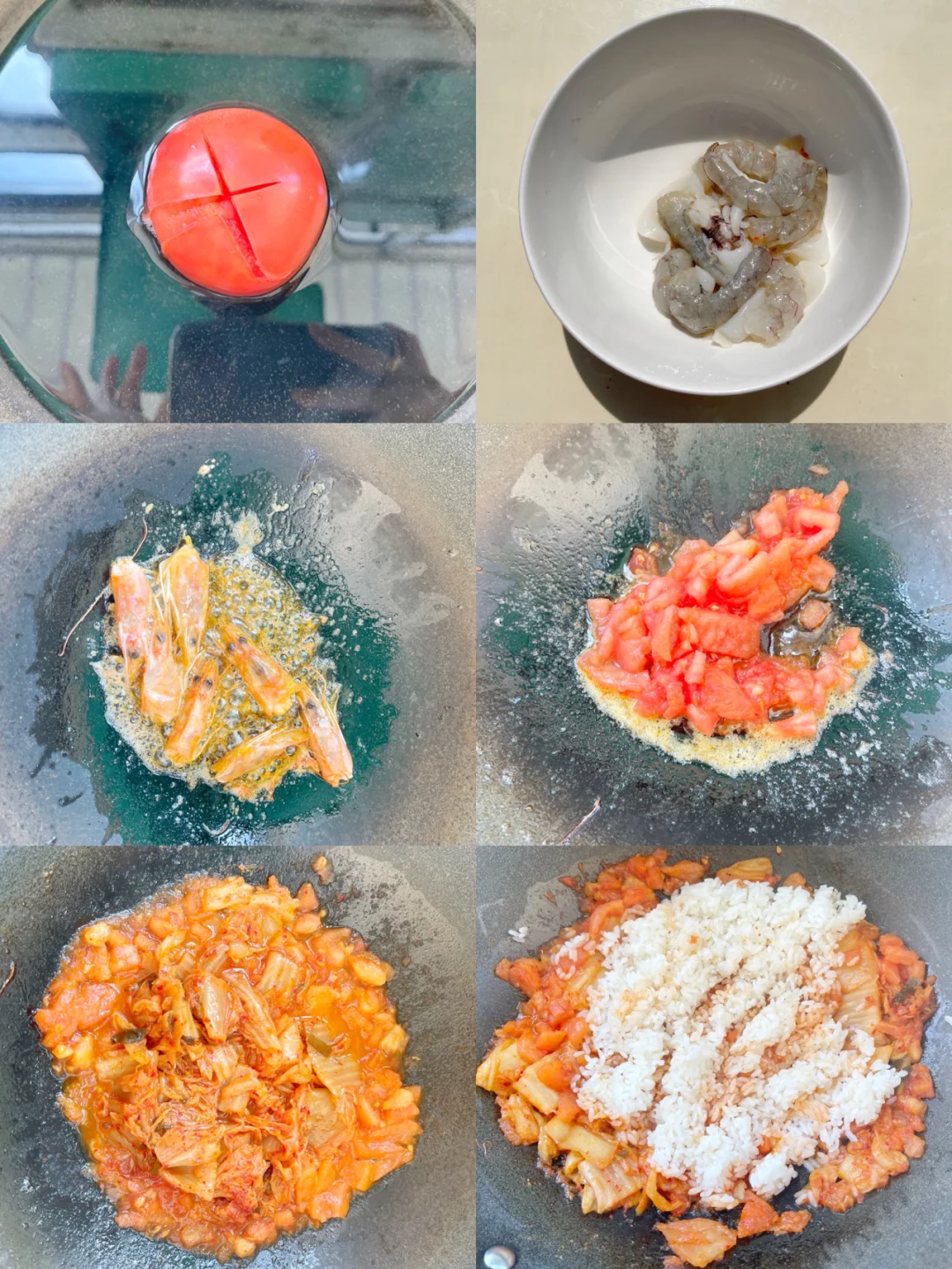 2️⃣锅里倒适量的橄榄油,放虾头,炒出虾油以后捞出。放入西红柿炒软烂以后放入泡菜和米饭,继续翻炒